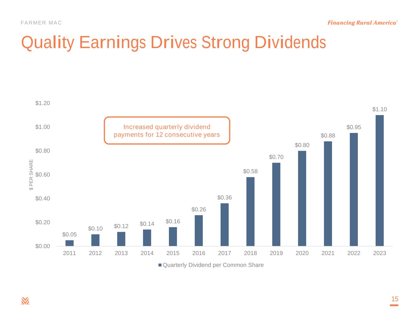 FARMER MAC $168.6 $197.0 $220.7 $255.5 $77.2$93.7 $100.6 $113.6 $124.3 $38.9 $0.0 $20.0 $40.0 $60.0 $80.0 $100.0 $120.0 $0.0 $50.0 $100.0 $150.0 $200.0 $250.0 2019 2020 2021 2022 YTD Q1 2023 C O R E E A R N IN G S $ IN M IL L IO N S N E T E F F E C T IV E S P R E A D $ I N M IL L IO N S Net Effective Spread & Core Earnings Net Effective Spread Core Earnings Growing, Recurring, High-Quality Earnings $21.1 $21.9 $23.6 $25.9 $26.5 $0.0 $5.0 $10.0 $15.0 $20.0 $25.0 $30.0 2019 2020 2021 2022 Q1 2023 $ I N B IL L IO N S Outstanding Business Volume Outstanding Business Volume 14 7% CAGR (2019-2022) 15% CAGR (2019-2022) 10% CAGR (2019-2022) CAGR is defined as Compound Annual Growth Rate Core earnings and net effective spread are non-GAAP measures. For more information on the use of these non-GAAP measures, please see page 3. For a reconciliation of core earnings to GAAP net income attributable to common stockholders and a reconciliation of net effective spread to GAAP net interest income, please refer to pages 27-28 of the Appendix.
