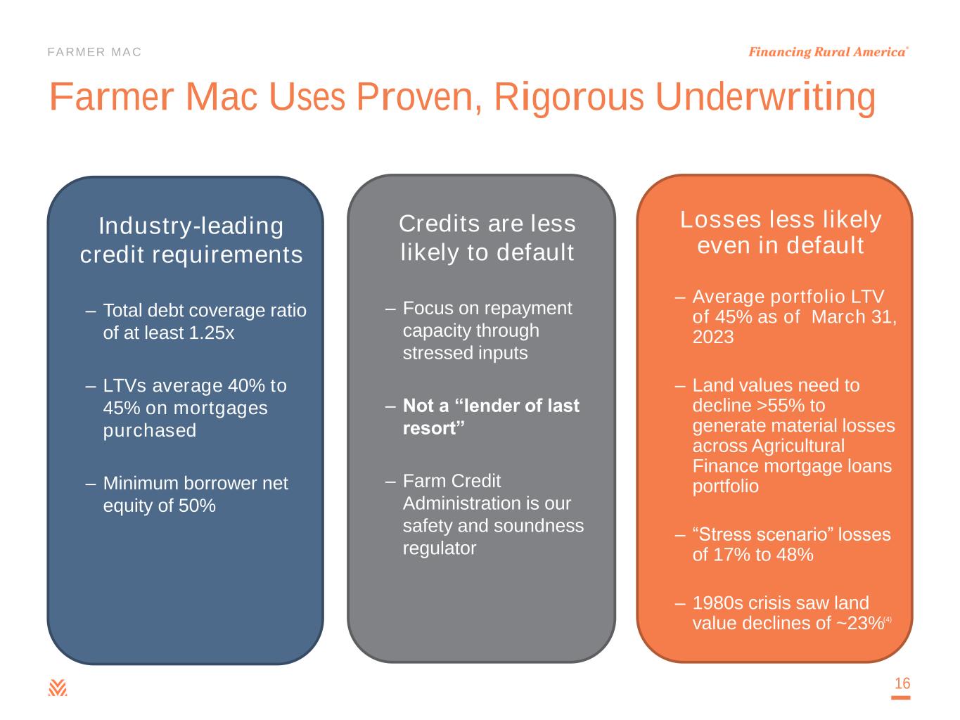FARMER MAC Quality Earnings Drives Strong Dividends $0.05 $0.10 $0.12 $0.14 $0.16 $0.26 $0.36 $0.58 $0.70 $0.80 $0.88 $0.95 $1.10 $0.00 $0.20 $0.40 $0.60 $0.80 $1.00 $1.20 2011 2012 2013 2014 2015 2016 2017 2018 2019 2020 2021 2022 2023 $ P E R S H A R E Quarterly Dividend per Common Share 15 Increased quarterly dividend payments for 12 consecutive years
