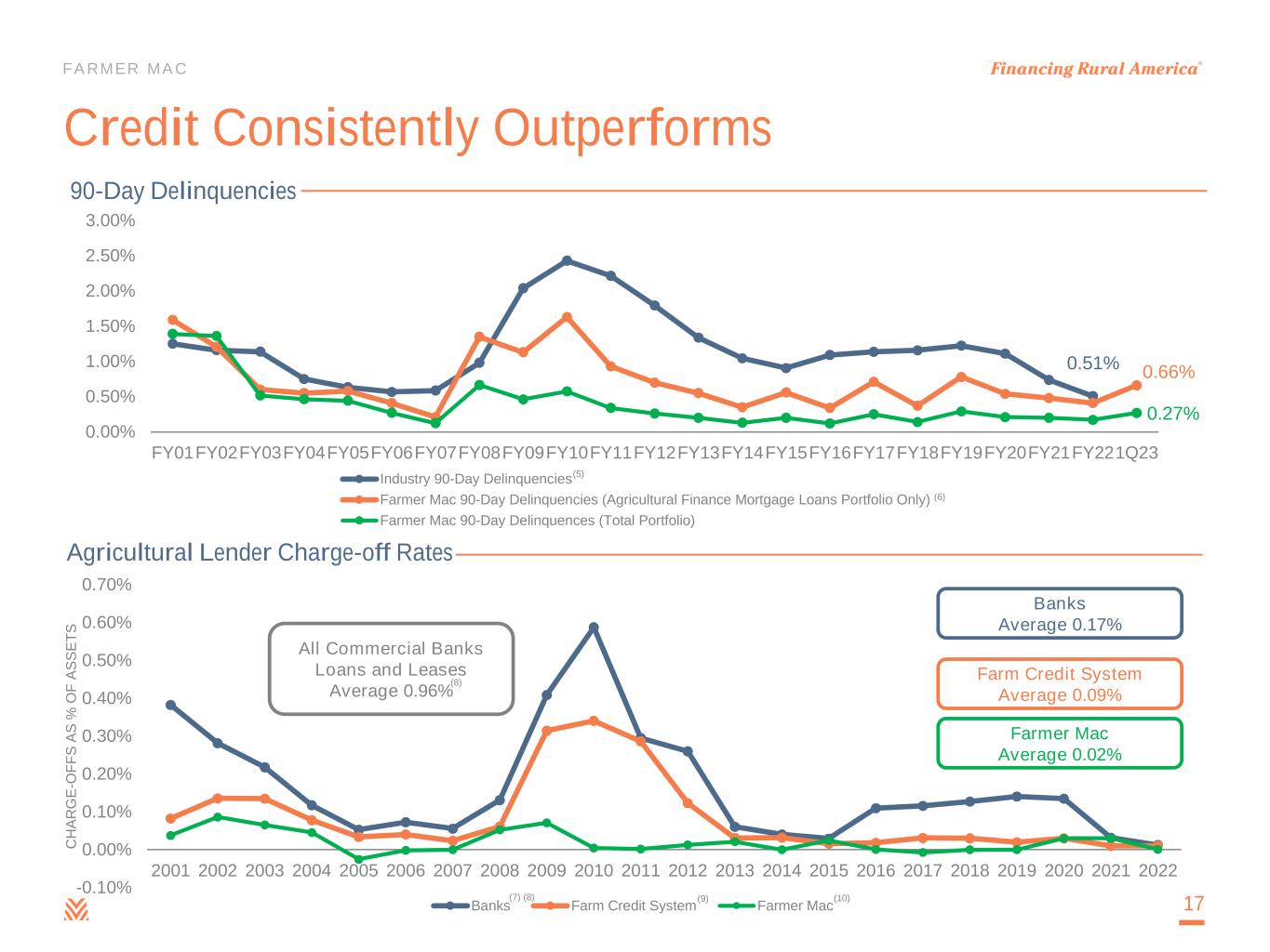 FARMER MAC Losses less likely even in default – Average portfolio LTV of 45% as of March 31, 2023 – Land values need to decline >55% to generate material losses across Agricultural Finance mortgage loans portfolio – “Stress scenario” losses of 17% to 48% – 1980s crisis saw land value declines of ~23% Farmer Mac Uses Proven, Rigorous Underwriting Industry-leading credit requirements – Total debt coverage ratio of at least 1.25x – LTVs average 40% to 45% on mortgages purchased – Minimum borrower net equity of 50% 16 Credits are less likely to default – Focus on repayment capacity through stressed inputs – Not a “lender of last resort” – Farm Credit Administration is our safety and soundness regulator (4)
