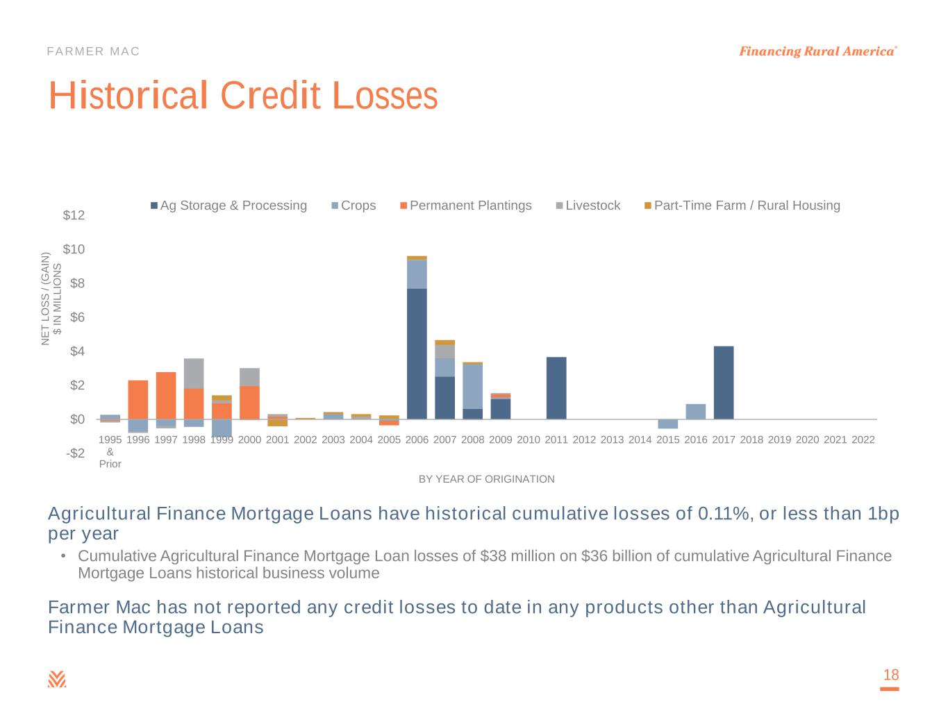 FARMER MAC Credit Consistently Outperforms 17 0.51% 0.66% 0.27% 0.00% 0.50% 1.00% 1.50% 2.00% 2.50% 3.00% FY01FY02FY03FY04FY05FY06FY07FY08FY09FY10FY11FY12FY13FY14FY15FY16FY17FY18FY19FY20FY21FY221Q23 90-Day Delinquencies Industry 90-Day Delinquencies Farmer Mac 90-Day Delinquencies (Agricultural Finance Mortgage Loans Portfolio Only) Farmer Mac 90-Day Delinquences (Total Portfolio) -0.10% 0.00% 0.10% 0.20% 0.30% 0.40% 0.50% 0.60% 0.70% 2001 2002 2003 2004 2005 2006 2007 2008 2009 2010 2011 2012 2013 2014 2015 2016 2017 2018 2019 2020 2021 2022 C H A R G E -O F F S A S % O F A S S E T S Agricultural Lender Charge-off Rates Banks Farm Credit System Farmer Mac Farmer Mac Average 0.02% Farm Credit System Average 0.09% Banks Average 0.17% All Commercial Banks Loans and Leases Average 0.96% (8) (5) (6) (7) (8) (9) (10)