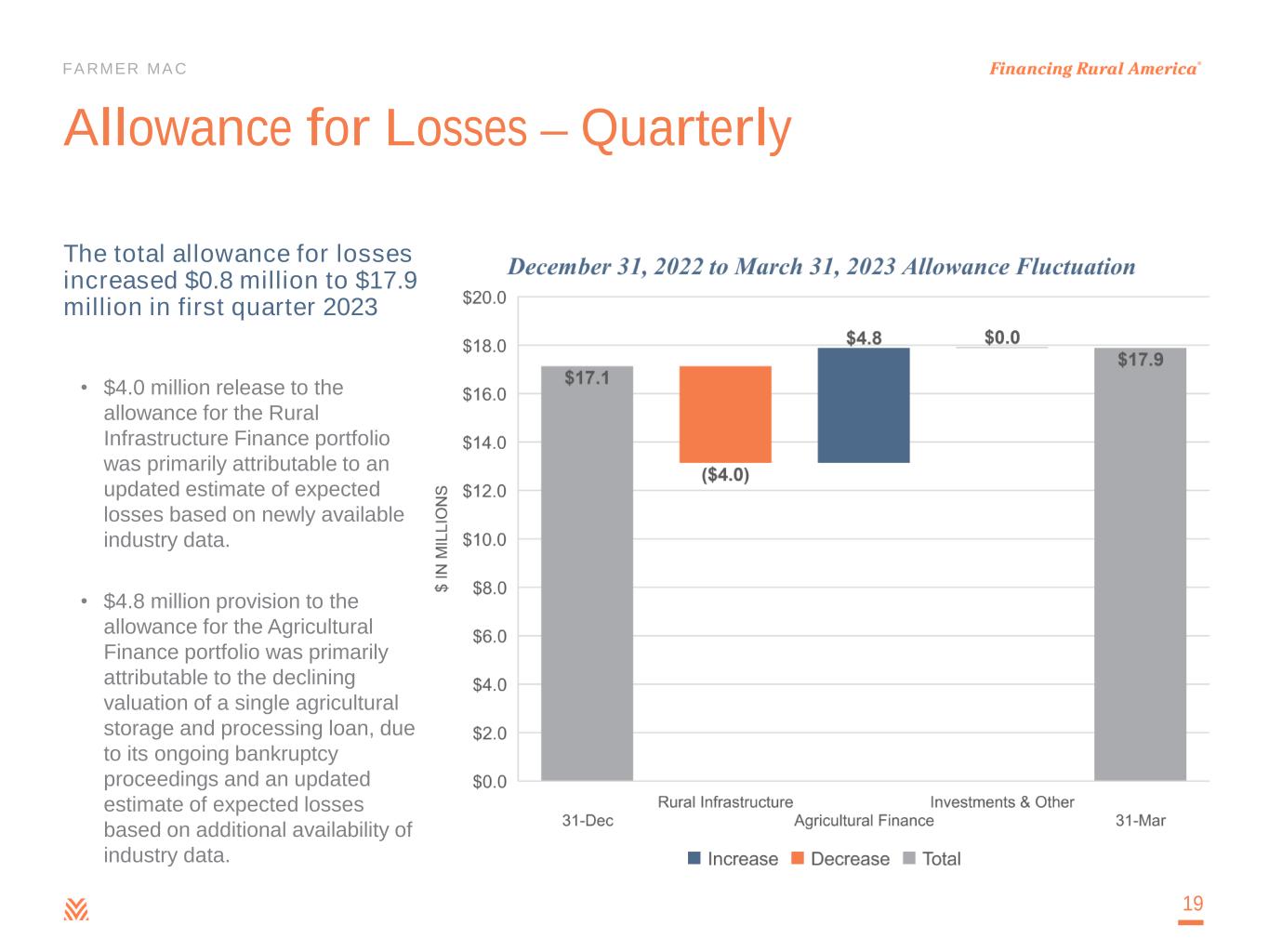FARMER MAC Historical Credit Losses Agricultural Finance Mortgage Loans have historical cumulative losses of 0.11%, or less than 1bp per year • Cumulative Agricultural Finance Mortgage Loan losses of $38 million on $36 billion of cumulative Agricultural Finance Mortgage Loans historical business volume Farmer Mac has not reported any credit losses to date in any products other than Agricultural Finance Mortgage Loans 18 -$2 $0 $2 $4 $6 $8 $10 $12 1995 & Prior 1996 1997 1998 1999 2000 2001 2002 2003 2004 2005 2006 2007 2008 2009 2010 2011 2012 2013 2014 2015 2016 2017 2018 2019 2020 2021 2022 N E T L O S S / ( G A IN ) $ I N M IL L IO N S BY YEAR OF ORIGINATION Ag Storage & Processing Crops Permanent Plantings Livestock Part-Time Farm / Rural Housing