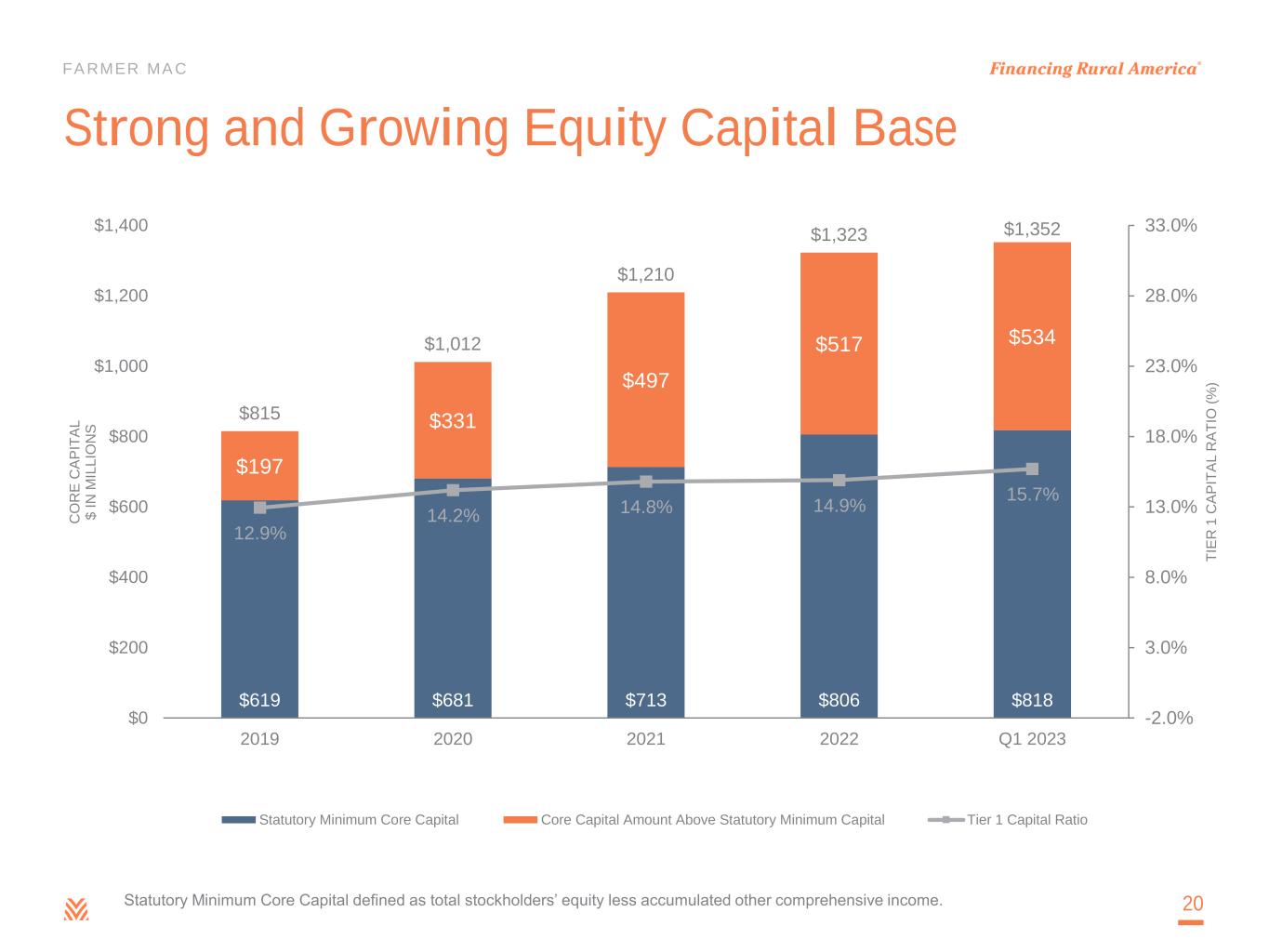 FARMER MAC Allowance for Losses – Quarterly 19 The total allowance for losses increased $0.8 million to $17.9 million in first quarter 2023 • $4.0 million release to the allowance for the Rural Infrastructure Finance portfolio was primarily attributable to an updated estimate of expected losses based on newly available industry data. • $4.8 million provision to the allowance for the Agricultural Finance portfolio was primarily attributable to the declining valuation of a single agricultural storage and processing loan, due to its ongoing bankruptcy proceedings and an updated estimate of expected losses based on additional availability of industry data.