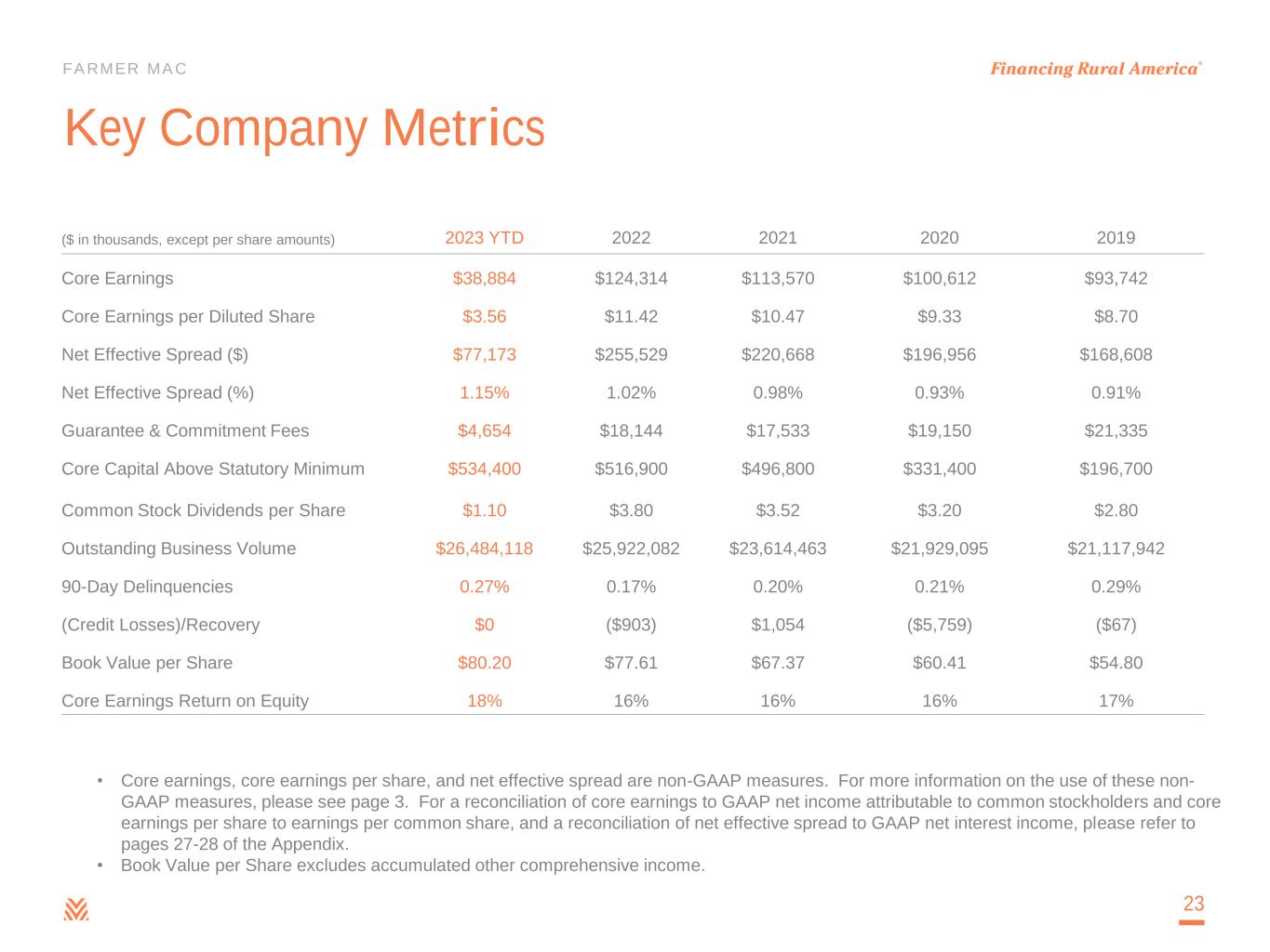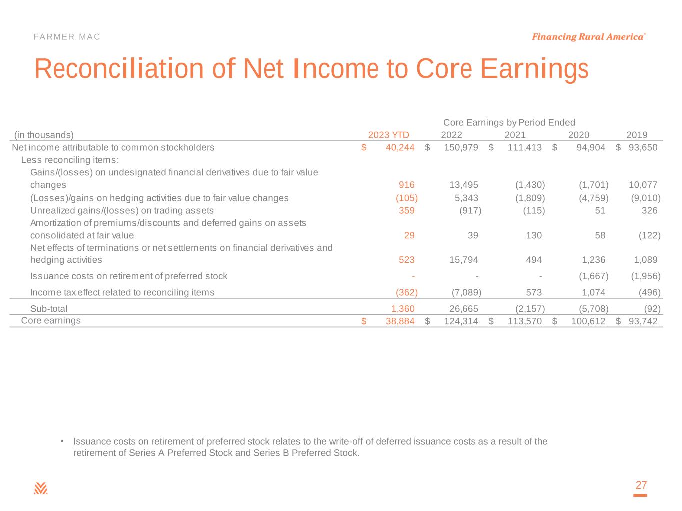 FARMER MAC Reconciliation of Net Income to Core Earnings 27 (in thousands) 2023 YTD 2022 2021 2020 2019 Net income attributable to common stockholders 40,244$ 150,979$ 111,413$ 94,904$ 93,650$ Less reconciling items: Gains/(losses) on undesignated financial derivatives due to fair value changes 916 13,495 (1,430) (1,701) 10,077 (Losses)/gains on hedging activities due to fair value changes (105) 5,343 (1,809) (4,759) (9,010) Unrealized gains/(losses) on trading assets 359 (917) (115) 51 326 Amortization of premiums/discounts and deferred gains on assets consolidated at fair value 29 39 130 58 (122) Net effects of terminations or net settlements on financial derivatives and hedging activities 523 15,794 494 1,236 1,089 Issuance costs on retirement of preferred stock - - - (1,667) (1,956) Income tax effect related to reconciling items (362) (7,089) 573 1,074 (496) Sub-total 1,360 26,665 (2,157) (5,708) (92) Core earnings 38,884$ 124,314$ 113,570$ 100,612$ 93,742$ Core Earnings by Period Ended • Issuance costs on retirement of preferred stock relates to the write-off of deferred issuance costs as a result of the retirement of Series A Preferred Stock and Series B Preferred Stock.