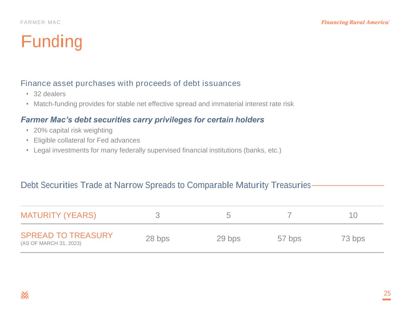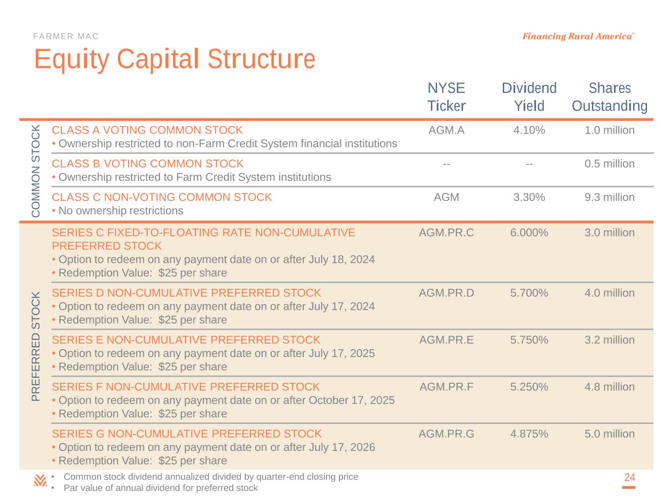 FARMER MAC Equity Capital Structure 24 NYSE Ticker Dividend Yield Shares Outstanding C O M M O N S T O C K CLASS A VOTING COMMON STOCK • Ownership restricted to non-Farm Credit System financial institutions AGM.A 4.10% 1.0 million CLASS B VOTING COMMON STOCK • Ownership restricted to Farm Credit System institutions -- -- 0.5 million CLASS C NON-VOTING COMMON STOCK • No ownership restrictions AGM 3.30% 9.3 million P R E F E R R E D S T O C K SERIES C FIXED-TO-FLOATING RATE NON-CUMULATIVE PREFERRED STOCK • Option to redeem on any payment date on or after July 18, 2024 • Redemption Value: $25 per share AGM.PR.C 6.000% 3.0 million SERIES D NON-CUMULATIVE PREFERRED STOCK • Option to redeem on any payment date on or after July 17, 2024 • Redemption Value: $25 per share AGM.PR.D 5.700% 4.0 million SERIES E NON-CUMULATIVE PREFERRED STOCK • Option to redeem on any payment date on or after July 17, 2025 • Redemption Value: $25 per share AGM.PR.E 5.750% 3.2 million SERIES F NON-CUMULATIVE PREFERRED STOCK • Option to redeem on any payment date on or after October 17, 2025 • Redemption Value: $25 per share AGM.PR.F 5.250% 4.8 million SERIES G NON-CUMULATIVE PREFERRED STOCK • Option to redeem on any payment date on or after July 17, 2026 • Redemption Value: $25 per share AGM.PR.G 4.875% 5.0 million • Common stock dividend annualized divided by quarter-end closing price • Par value of annual dividend for preferred stock