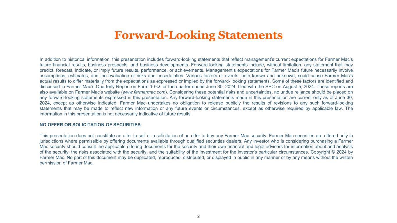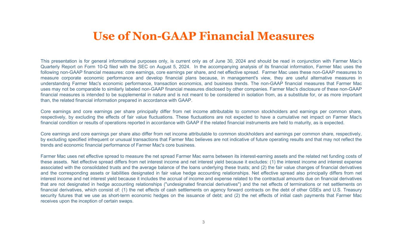 Forward-Looking Statements 2 In addition to historical information, this presentation includes forward-looking statements that reflect management’s current expectations for Farmer Mac’s future financial results, business prospects, and business developments. Forward-looking statements include, without limitation, any statement that may predict, forecast, indicate, or imply future results, performance, or achievements. Management’s expectations for Farmer Mac’s future necessarily involve assumptions, estimates, and the evaluation of risks and uncertainties. Various factors or events, both known and unknown, could cause Farmer Mac’s actual results to differ materially from the expectations as expressed or implied by the forward- looking statements. Some of these factors are identified and discussed in Farmer Mac’s Quarterly Report on Form 10-Q for the quarter ended June 30, 2024, filed with the SEC on August 5, 2024. These reports are also available on Farmer Mac’s website (www.farmermac.com). Considering these potential risks and uncertainties, no undue reliance should be placed on any forward-looking statements expressed in this presentation. Any forward-looking statements made in this presentation are current only as of June 30, 2024, except as otherwise indicated. Farmer Mac undertakes no obligation to release publicly the results of revisions to any such forward-looking statements that may be made to reflect new information or any future events or circumstances, except as otherwise required by applicable law. The information in this presentation is not necessarily indicative of future results. NO OFFER OR SOLICITATION OF SECURITIES This presentation does not constitute an offer to sell or a solicitation of an offer to buy any Farmer Mac security. Farmer Mac securities are offered only in jurisdictions where permissible by offering documents available through qualified securities dealers. Any investor who is considering purchasing a Farmer Mac security should consult the applicable offering documents for the security and their own financial and legal advisors for information about and analysis of the security, the risks associated with the security, and the suitability of the investment for the investor’s particular circumstances. Copyright © 2024 by Farmer Mac. No part of this document may be duplicated, reproduced, distributed, or displayed in public in any manner or by any means without the written permission of Farmer Mac.