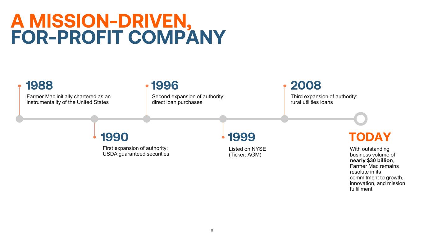 5 MISSION FOCUSED Strengthen Rural America Lower Financing Costs Increase Access to Credit Our Corporate Culture is Rooted in Our Values • Farmer Mac is a publicly traded company driven by our mission to increase the accessibility of credit for American agriculture and rural infrastructure. • NYSE: AGM & AGM.A • Farmer Mac increases the accessibility of financing and lowers financing costs for American agriculture and rural infrastructure. • GSE funding advantage • Farmer Mac provides a secondary market to a diverse customer set, offering a wide range of products and innovative solutions. • Successfully issued 4 large, structured FARM Series Agricultural Mortgage- Backed Securities (AMBS) • Innovation • Passion for our Mission • Integrity • Excellence • Relationships