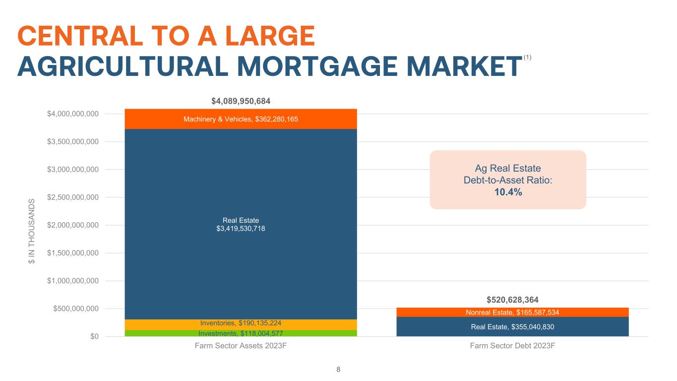 7 Bradford T. Nordholm President & Chief Executive Officer • 40+ years of agricultural and energy finance experience. • Joined Farmer Mac in October 2018 from Starwood Energy Group, a leading private investment firm where he served as CEO and later as Vice Chairman. • Prior experience includes CEO of US Central and management positions at National Cooperative and within the Farm Credit System. EXECUTIVE LEADERSHIP Zachary N. Carpenter Executive Vice President – Chief Business Officer • 15+ years of experience in agribusiness banking, capital markets, finance, and corporate strategy. • Joined Farmer Mac in 2019 from CoBank, where he previously served as Managing Director and Sector Vice President of its Corporate Agribusiness Banking Group. • Prior experience includes Executive Director in CoBank’s Capital Markets division and Vice President in Finance and Corporate Strategy at Goldman Sachs. Aparna Ramesh Executive Vice President – Chief Financial Officer & Treasurer • 20+ years of experience in mission-oriented finance roles. • Joined Farmer Mac in 2020 from Federal Reserve Bank of Boston, where she previously served as Senior Vice President and Chief Financial Officer. • Prior experience includes roles spanning product management, asset-liability management and profitability within Cambridge Savings Bank and M&T Bank.
