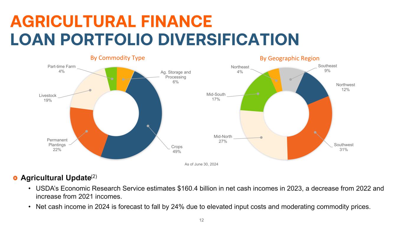 Each operating segment is comprised of both spread-based and fee-income products • Loan purchases (spread) • Wholesale Funding (spread) • Purchase Commitments (fee) • Loans Serviced for Others (fee) Net effective spread and fees determined by a variety of factors, including: • Funding execution • Credit profile • Economic factors 11 SEGMENT PROFITABILITY Line of Business Segment Volume ($ IN BILLIONS AS OF 6/30/2024) 2Q24 Net Effective Spread (%) Risk-Adjusted Gross Return on Allocated Capital (%) Agricultural Finance Farm & Ranch $18.5 0.98% 28% Corporate AgFinance $1.8 1.91% 25% Rural Infrastructure Finance Rural Utilities $7.6 0.44% 19% Renewable Energy $0.9 1.86% 29% Treasury Funding – 0.41% – Investments – 0.04% – $28.8 1.14% –