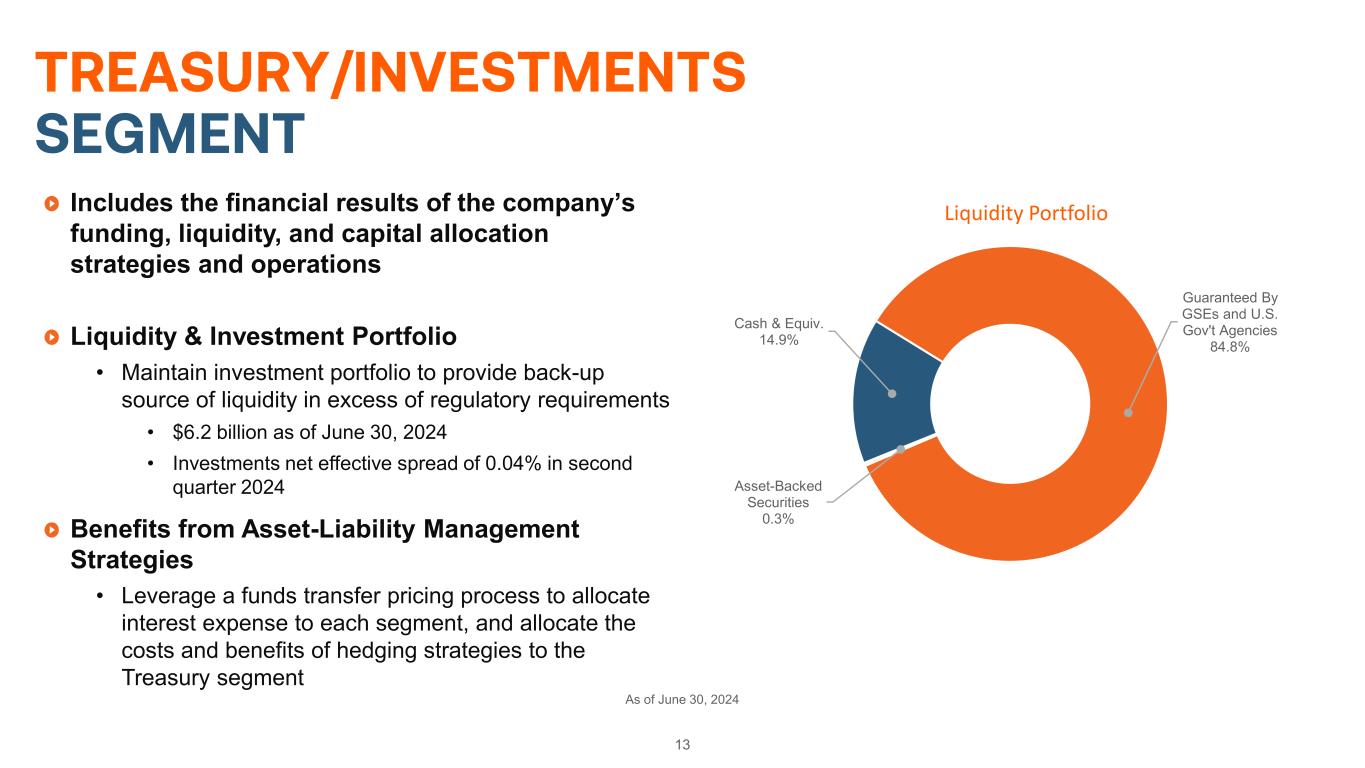 13 TREASURY/INVESTMENTS SEGMENT As of June 30, 2024 Includes the financial results of the company’s funding, liquidity, and capital allocation strategies and operations Liquidity & Investment Portfolio • Maintain investment portfolio to provide back-up source of liquidity in excess of regulatory requirements • $6.2 billion as of June 30, 2024 • Investments net effective spread of 0.04% in second quarter 2024 Benefits from Asset-Liability Management Strategies • Leverage a funds transfer pricing process to allocate interest expense to each segment, and allocate the costs and benefits of hedging strategies to the Treasury segment Cash & Equiv. 14.9% Guaranteed By GSEs and U.S. Gov't Agencies 84.8% Asset-Backed Securities 0.3% Liquidity Portfolio