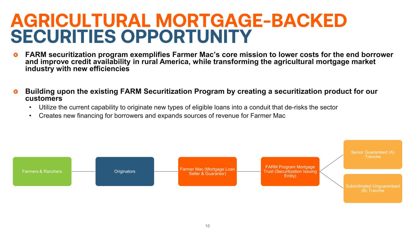 GROWTH OPPORTUNITIES TO INCREASE ASSETS UNDER MANAGEMENT 15Farm & Ranch Corporate AgFinance Core Farm & Ranch business provides consistent growth opportunities throughout market cycles. Rural Utilities Well positioned to benefit from the growing demand for renewable power and generation Agricultural Finance Rural Infrastructure Finance Renewable Energy Relative Size of Volume Opportunity Securitization Pool Purchases Syndications Wholesale Funding Loan Servicing Collateral Value Efficiencies Renewable Energy & Project Finance Rural Broadband Growing Electricity Demand