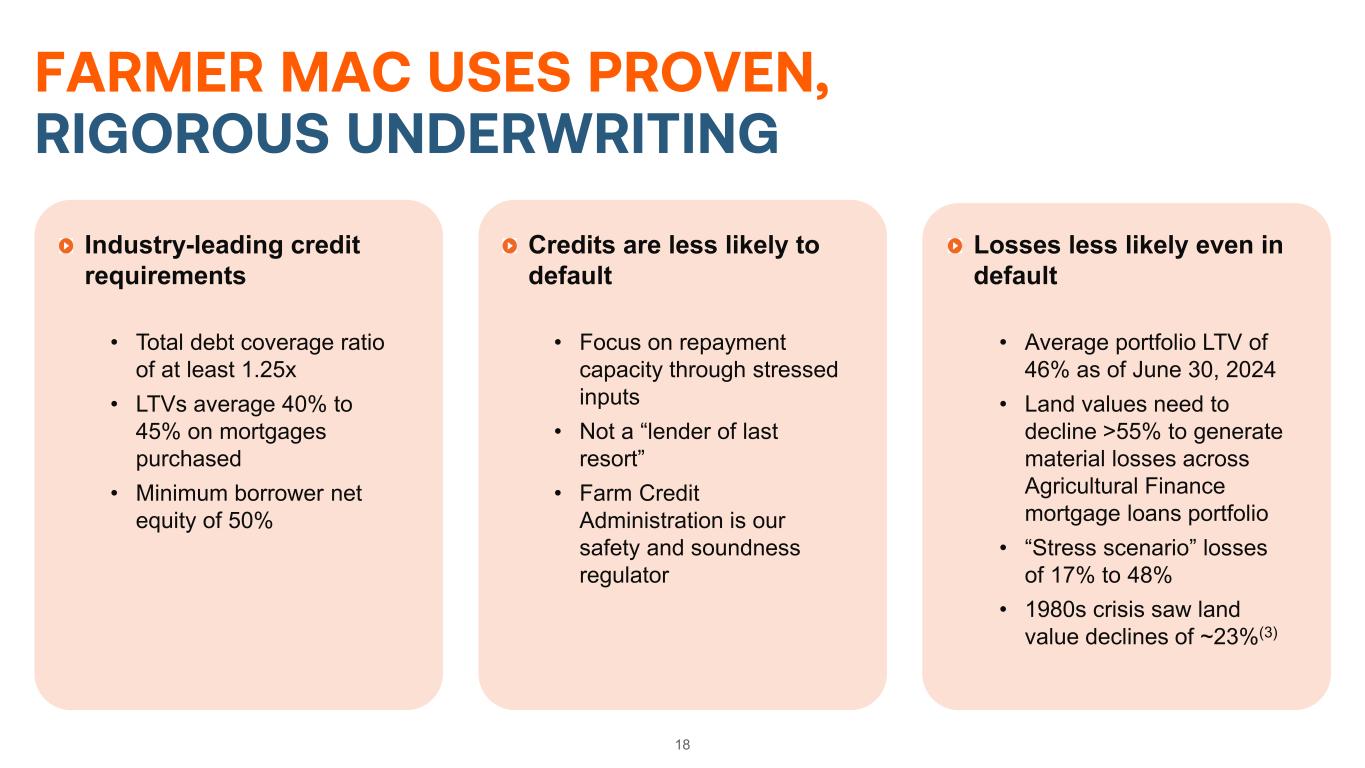 As Farmer Mac grows its business, securitization is available as a tool to achieve capital relief • Securitization is expected to stimulate growth by increasing Farmer Mac’s brand awareness in the capital markets Securitization provides an alternative option to funding longer-term loans, while reducing interest rate risk. 17 POSITIONING FOR GROWTH WITH SECURITIZATION FARM 2024-1 FARM 2023-1 FARM 2022-1 FARM 2021-1 Number of Loans 443 408 450 384 Average Principal Balance 308,090,132 283,591,175 301,105,804 302,744,111 Product Type Fixed (41%) Variable-Rate (59%) Fixed (80%) Variable Rate (20%) Fixed (82%) Variable Rate (18%) Fixed (82%) Variable Rate (18%) Average Debt Coverage Ratio 1.93x 2.05x 2.04x 1.56x Average Original LTV 50% 49% 49% 42% Average Net Rate 5.122% 3.031% 2.940% 3.249% Top 5 States CA (24%), NE (10%), OR (8%), TX (7%), SD (5%) MN (17%), CA (11%), MO (9%), IL (9%), NE (8%) MN (17%), CA (13%), NE (9%), MO (8%), IL (7%) CA (17%), MN (15%), OR (9%), MO (8%), IL (8%)
