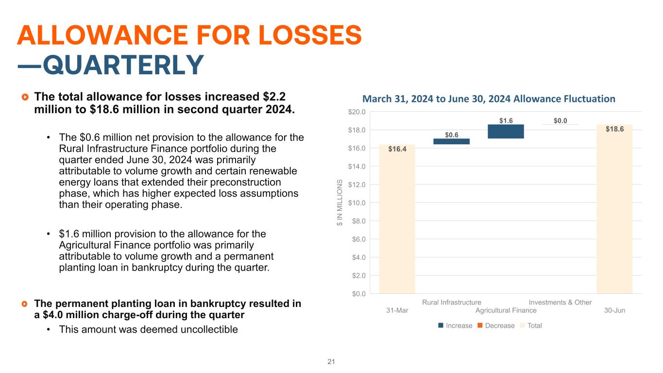21 ALLOWANCE FOR LOSSES —QUARTERLY The total allowance for losses increased $2.2 million to $18.6 million in second quarter 2024. • The $0.6 million net provision to the allowance for the Rural Infrastructure Finance portfolio during the quarter ended June 30, 2024 was primarily attributable to volume growth and certain renewable energy loans that extended their preconstruction phase, which has higher expected loss assumptions than their operating phase. • $1.6 million provision to the allowance for the Agricultural Finance portfolio was primarily attributable to volume growth and a permanent planting loan in bankruptcy during the quarter. The permanent planting loan in bankruptcy resulted in a $4.0 million charge-off during the quarter • This amount was deemed uncollectible