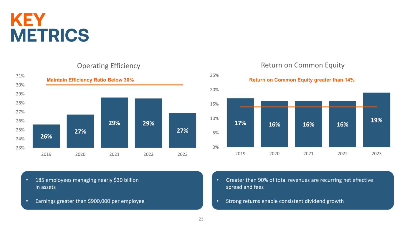 KEY METRICS 23 26% 27% 29% 29% 27% 23% 24% 25% 26% 27% 28% 29% 30% 31% 2019 2020 2021 2022 2023 Operating Efficiency Maintain Efficiency Ratio Below 30% 17% 16% 16% 16% 19% 0% 5% 10% 15% 20% 25% 2019 2020 2021 2022 2023 Return on Common Equity Return on Common Equity greater than 14% • 185 employees managing nearly $30 billion in assets • Earnings greater than $900,000 per employee • Greater than 90% of total revenues are recurring net effective spread and fees • Strong returns enable consistent dividend growth