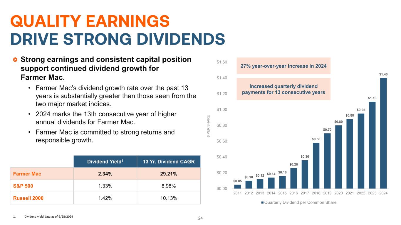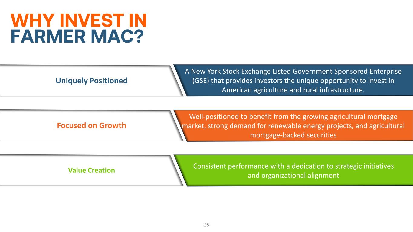 24 QUALITY EARNINGS DRIVE STRONG DIVIDENDS Strong earnings and consistent capital position support continued dividend growth for Farmer Mac. • Farmer Mac’s dividend growth rate over the past 13 years is substantially greater than those seen from the two major market indices. • 2024 marks the 13th consecutive year of higher annual dividends for Farmer Mac. • Farmer Mac is committed to strong returns and responsible growth. Dividend Yield1 13 Yr. Dividend CAGR Farmer Mac 2.34% 29.21% S&P 500 1.33% 8.98% Russell 2000 1.42% 10.13% $0.05 $0.10 $0.12 $0.14 $0.16 $0.26 $0.36 $0.58 $0.70 $0.80 $0.88 $0.95 $1.10 $1.40 $0.00 $0.20 $0.40 $0.60 $0.80 $1.00 $1.20 $1.40 $1.60 2011 2012 2013 2014 2015 2016 2017 2018 2019 2020 2021 2022 2023 2024 $ PE R S H AR E Quarterly Dividend per Common Share 27% year-over-year increase in 2024 Increased quarterly dividend payments for 13 consecutive years 1. Dividend yield data as of 6/28/2024