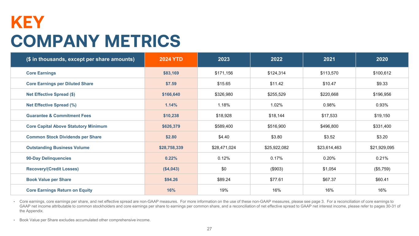 27 KEY COMPANY METRICS ($ in thousands, except per share amounts) 2024 YTD 2023 2022 2021 2020 Core Earnings $83,169 $171,156 $124,314 $113,570 $100,612 Core Earnings per Diluted Share $7.59 $15.65 $11.42 $10.47 $9.33 Net Effective Spread ($) $166,640 $326,980 $255,529 $220,668 $196,956 Net Effective Spread (%) 1.14% 1.18% 1.02% 0.98% 0.93% Guarantee & Commitment Fees $10,238 $18,928 $18,144 $17,533 $19,150 Core Capital Above Statutory Minimum $626,379 $589,400 $516,900 $496,800 $331,400 Common Stock Dividends per Share $2.80 $4.40 $3.80 $3.52 $3.20 Outstanding Business Volume $28,758,339 $28,471,024 $25,922,082 $23,614,463 $21,929,095 90-Day Delinquencies 0.22% 0.12% 0.17% 0.20% 0.21% Recovery/(Credit Losses) ($4,043) $0 ($903) $1,054 ($5,759) Book Value per Share $94.26 $89.24 $77.61 $67.37 $60.41 Core Earnings Return on Equity 16% 19% 16% 16% 16% • Core earnings, core earnings per share, and net effective spread are non-GAAP measures. For more information on the use of these non-GAAP measures, please see page 3. For a reconciliation of core earnings to GAAP net income attributable to common stockholders and core earnings per share to earnings per common share, and a reconciliation of net effective spread to GAAP net interest income, please refer to pages 30-31 of the Appendix. • Book Value per Share excludes accumulated other comprehensive income.