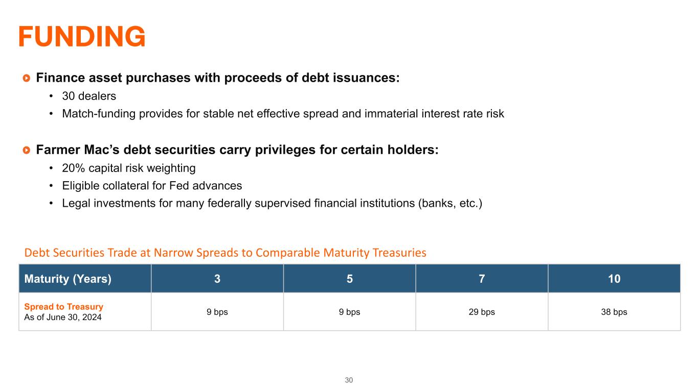 29 EQUITY CAPITAL STRUCTURE • Common stock dividend annualized divided by quarter-end closing price. • Par value of annual dividend for preferred stock. Summary Stratifications NYSE Ticker Dividend Yield Shares Outstanding COMMON STOCK CLASS A VOTING COMMON STOCK • Ownership restricted to non-Farm Credit System financial institutions AGM.A 4.42% 1.0 million CLASS B VOTING COMMON STOCK • Ownership restricted to Farm Credit System institutions – – 0.5 million CLASS C NON-VOTING COMMON STOCK • No ownership restrictions AGM 3.10% 9.3 million PREFERRED STOCK SERIES D NON-CUMULATIVE PREFERRED STOCK • Option to redeem on any payment date on or after July 17, 2024 • Redemption Value: $25 per share AGM.PR.D 5.700% 4.0 million SERIES E NON-CUMULATIVE PREFERRED STOCK • Option to redeem on any payment date on or after July 17, 2025 • Redemption Value: $25 per share AGM.PR.E 5.750% 3.2 million SERIES F NON-CUMULATIVE PREFERRED STOCK • Option to redeem on any payment date on or after October 18, 2025 • Redemption Value: $25 per share AGM.PR.F 5.250% 4.8 million SERIES G NON-CUMULATIVE PREFERRED STOCK • Option to redeem on any payment date on or after July 17, 2026 • Redemption Value: $25 per share AGM.PR.G 4.875% 5.0 million