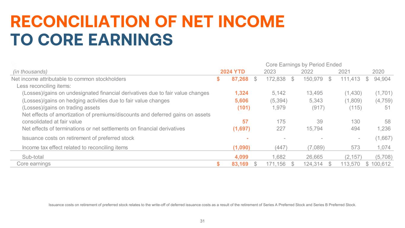 31 RECONCILIATION OF NET INCOME TO CORE EARNINGS (in thousands) 2024 YTD 2023 2022 2021 2020 Net income attributable to common stockholders 87,268$ 172,838$ 150,979$ 111,413$ 94,904$ Less reconciling items: (Losses)/gains on undesignated financial derivatives due to fair value changes 1,324 5,142 13,495 (1,430) (1,701) (Losses)/gains on hedging activities due to fair value changes 5,606 (5,394) 5,343 (1,809) (4,759) (Losses)/gains on trading assets (101) 1,979 (917) (115) 51 Net effects of amortization of premiums/discounts and deferred gains on assets consolidated at fair value 57 175 39 130 58 Net effects of terminations or net settlements on financial derivatives (1,697) 227 15,794 494 1,236 Issuance costs on retirement of preferred stock - - - - (1,667) Income tax effect related to reconciling items (1,090) (447) (7,089) 573 1,074 Sub-total 4,099 1,682 26,665 (2,157) (5,708) Core earnings 83,169$ 171,156$ 124,314$ 113,570$ 100,612$ Core Earnings by Period Ended Issuance costs on retirement of preferred stock relates to the write-off of deferred issuance costs as a result of the retirement of Series A Preferred Stock and Series B Preferred Stock.