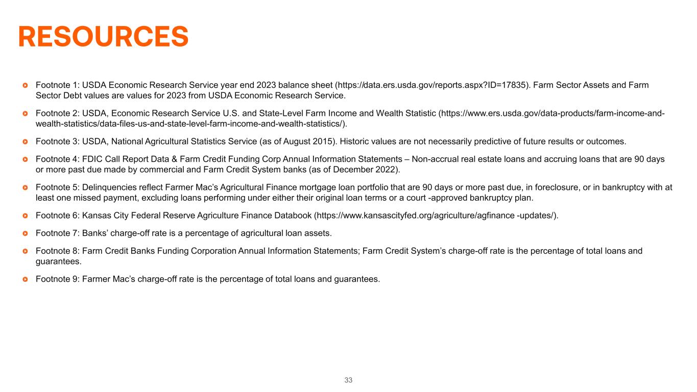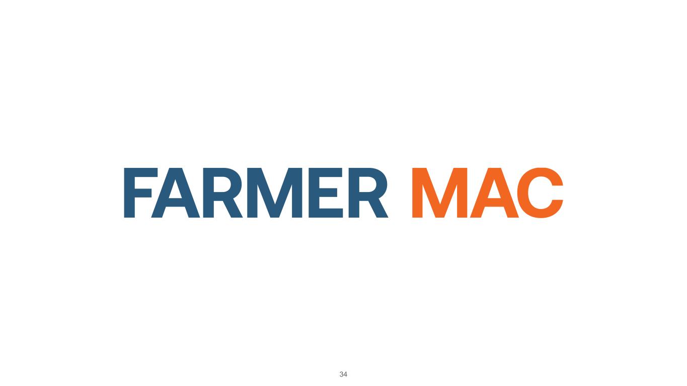 33 RESOURCES Footnote 1: USDA Economic Research Service year end 2023 balance sheet (https://data.ers.usda.gov/reports.aspx?ID=17835). Farm Sector Assets and Farm Sector Debt values are values for 2023 from USDA Economic Research Service. Footnote 2: USDA, Economic Research Service U.S. and State-Level Farm Income and Wealth Statistic (https://www.ers.usda.gov/data-products/farm-income-and- wealth-statistics/data-files-us-and-state-level-farm-income-and-wealth-statistics/). Footnote 3: USDA, National Agricultural Statistics Service (as of August 2015). Historic values are not necessarily predictive of future results or outcomes. Footnote 4: FDIC Call Report Data & Farm Credit Funding Corp Annual Information Statements – Non-accrual real estate loans and accruing loans that are 90 days or more past due made by commercial and Farm Credit System banks (as of December 2022). Footnote 5: Delinquencies reflect Farmer Mac’s Agricultural Finance mortgage loan portfolio that are 90 days or more past due, in foreclosure, or in bankruptcy with at least one missed payment, excluding loans performing under either their original loan terms or a court -approved bankruptcy plan. Footnote 6: Kansas City Federal Reserve Agriculture Finance Databook (https://www.kansascityfed.org/agriculture/agfinance -updates/). Footnote 7: Banks’ charge-off rate is a percentage of agricultural loan assets. Footnote 8: Farm Credit Banks Funding Corporation Annual Information Statements; Farm Credit System’s charge-off rate is the percentage of total loans and guarantees. Footnote 9: Farmer Mac’s charge-off rate is the percentage of total loans and guarantees.