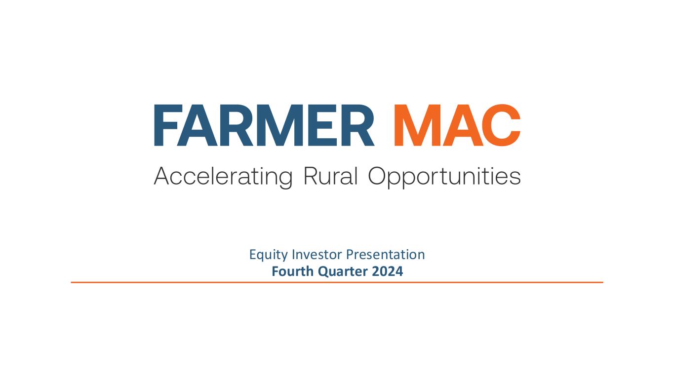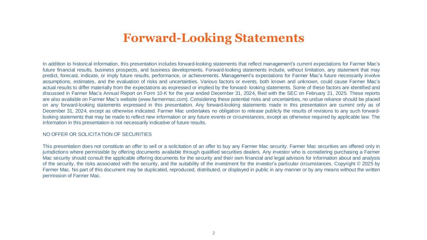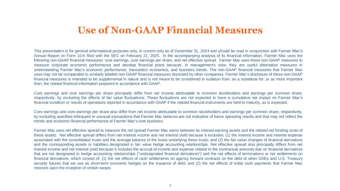 Forward-Looking Statements 2 In addition to historical information, this presentation includes forward-looking statements that reflect management’s current expectations for Farmer Mac’s future financial results, business prospects, and business developments. Forward-looking statements include, without limitation, any statement that may predict, forecast, indicate, or imply future results, performance, or achievements. Management’s expectations for Farmer Mac’s future necessarily involve assumptions, estimates, and the evaluation of risks and uncertainties. Various factors or events, both known and unknown, could cause Farmer Mac’s actual results to differ materially from the expectations as expressed or implied by the forward- looking statements. Some of these factors are identified and discussed in Farmer Mac’s Annual Report on Form 10-K for the year ended December 31, 2024, filed with the SEC on February 21, 2025. These reports are also available on Farmer Mac’s website (www.farmermac.com). Considering these potential risks and uncertainties, no undue reliance should be placed on any forward-looking statements expressed in this presentation. Any forward-looking statements made in this presentation are current only as of December 31, 2024, except as otherwise indicated. Farmer Mac undertakes no obligation to release publicly the results of revisions to any such forward- looking statements that may be made to reflect new information or any future events or circumstances, except as otherwise required by applicable law. The information in this presentation is not necessarily indicative of future results. NO OFFER OR SOLICITATION OF SECURITIES This presentation does not constitute an offer to sell or a solicitation of an offer to buy any Farmer Mac security. Farmer Mac securities are offered only in jurisdictions where permissible by offering documents available through qualified securities dealers. Any investor who is considering purchasing a Farmer Mac security should consult the applicable offering documents for the security and their own financial and legal advisors for information about and analysis of the security, the risks associated with the security, and the suitability of the investment for the investor’s particular circumstances. Copyright © 2025 by Farmer Mac. No part of this document may be duplicated, reproduced, distributed, or displayed in public in any manner or by any means without the written permission of Farmer Mac.
