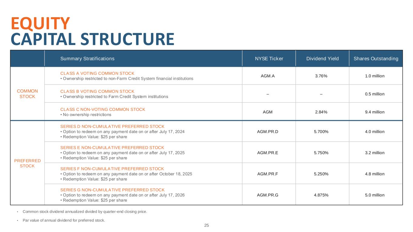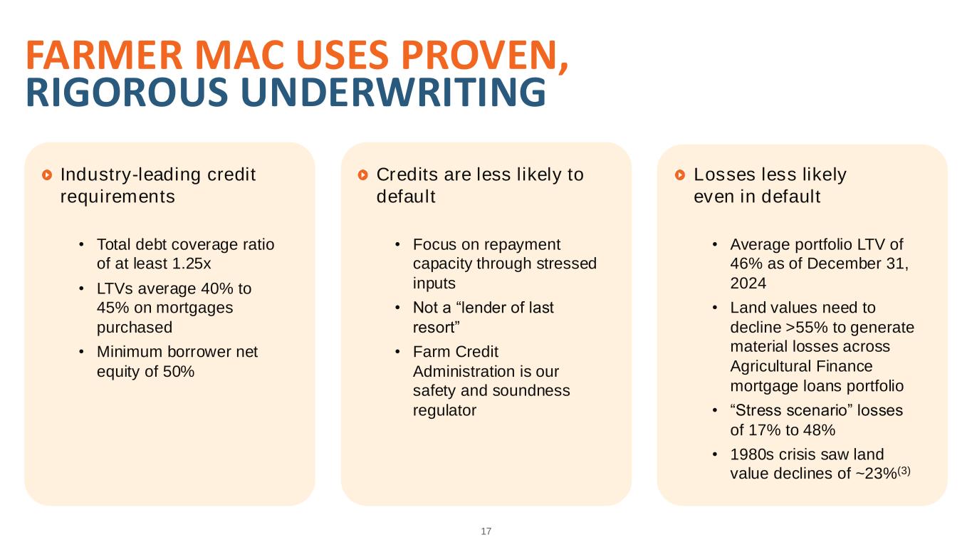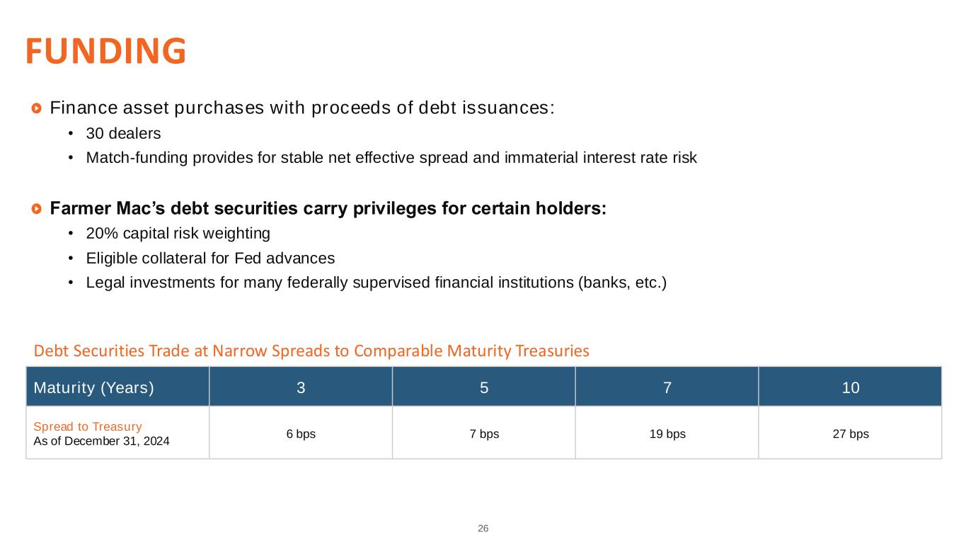 Forward-Looking Statements 2 In addition to historical information, this presentation includes forward-looking statements that reflect management’s current expectations for Farmer Mac’s future financial results, business prospects, and business developments. Forward-looking statements include, without limitation, any statement that may predict, forecast, indicate, or imply future results, performance, or achievements. Management’s expectations for Farmer Mac’s future necessarily involve assumptions, estimates, and the evaluation of risks and uncertainties. Various factors or events, both known and unknown, could cause Farmer Mac’s actual results to differ materially from the expectations as expressed or implied by the forward- looking statements. Some of these factors are identified and discussed in Farmer Mac’s Annual Report on Form 10-K for the year ended December 31, 2024, filed with the SEC on February 21, 2025. These reports are also available on Farmer Mac’s website (www.farmermac.com). Considering these potential risks and uncertainties, no undue reliance should be placed on any forward-looking statements expressed in this presentation. Any forward-looking statements made in this presentation are current only as of December 31, 2024, except as otherwise indicated. Farmer Mac undertakes no obligation to release publicly the results of revisions to any such forward- looking statements that may be made to reflect new information or any future events or circumstances, except as otherwise required by applicable law. The information in this presentation is not necessarily indicative of future results. NO OFFER OR SOLICITATION OF SECURITIES This presentation does not constitute an offer to sell or a solicitation of an offer to buy any Farmer Mac security. Farmer Mac securities are offered only in jurisdictions where permissible by offering documents available through qualified securities dealers. Any investor who is considering purchasing a Farmer Mac security should consult the applicable offering documents for the security and their own financial and legal advisors for information about and analysis of the security, the risks associated with the security, and the suitability of the investment for the investor’s particular circumstances. Copyright © 2025 by Farmer Mac. No part of this document may be duplicated, reproduced, distributed, or displayed in public in any manner or by any means without the written permission of Farmer Mac.