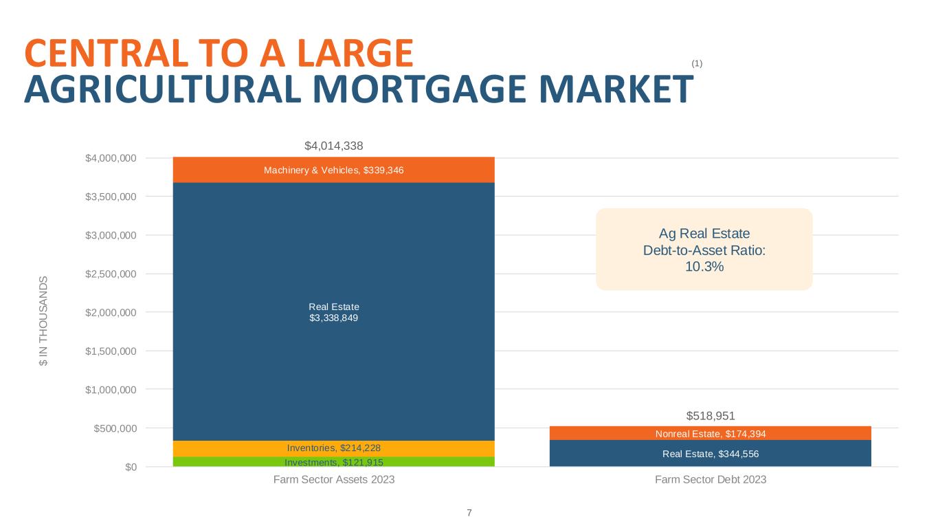 A MISSION-DRIVEN, FOR-PROFIT COMPANY 6 TODAY1999 Listed on NYSE (Ticker: AGM) 1990 First expansion of authority: USDA guaranteed securities 1988 Farmer Mac initially chartered as an instrumentality of the United States 1996 Second expansion of authority: direct loan purchases 2008 Third expansion of authority: rural utilities loans With outstanding business volume of nearly $30 billion, Farmer Mac remains resolute in its commitment to growth, innovation, and mission fulfillment