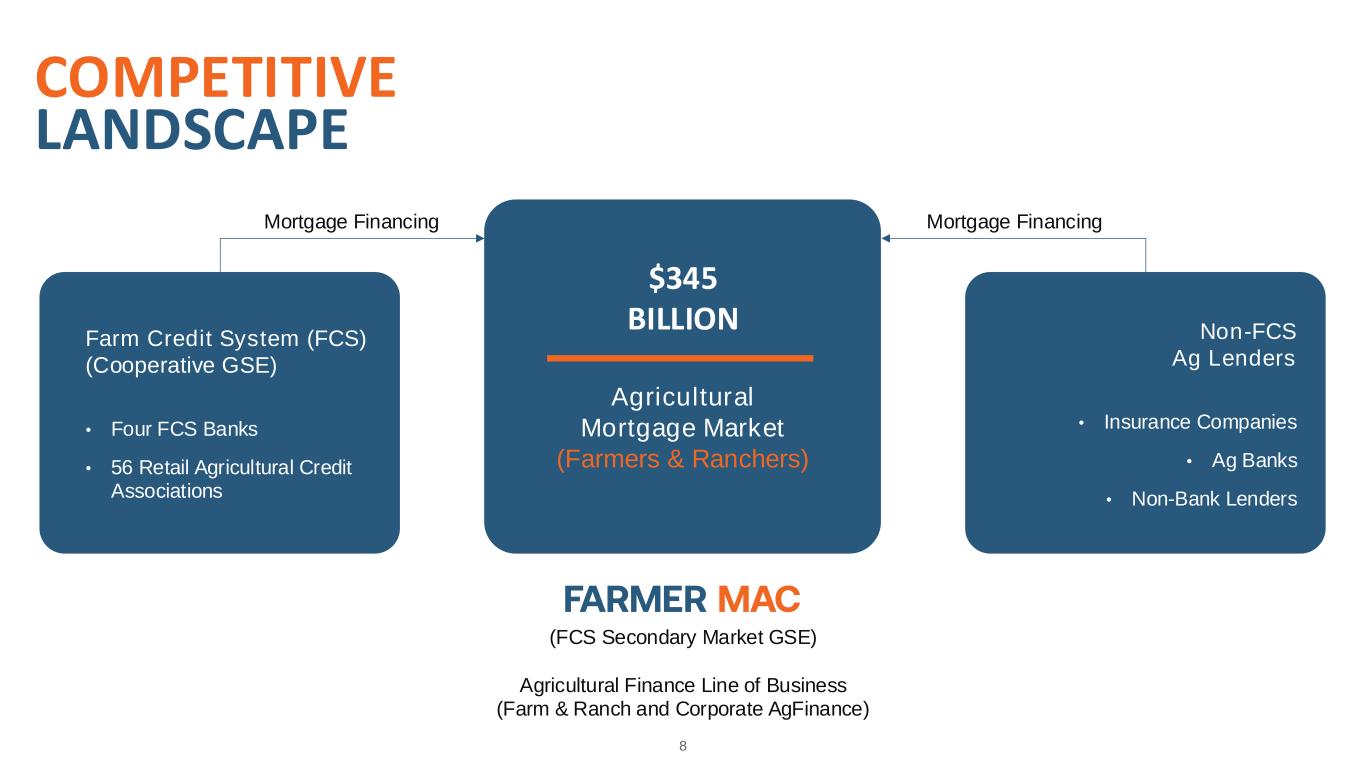 CENTRAL TO A LARGE AGRICULTURAL MORTGAGE MARKET 7 Investments, $121,915 Inventories, $214,228 Real Estate $3,338,849 Machinery & Vehicles, $339,346 $4,014,338 Real Estate, $344,556 Nonreal Estate, $174,394 $518,951 $0 $500,000 $1,000,000 $1,500,000 $2,000,000 $2,500,000 $3,000,000 $3,500,000 $4,000,000 Farm Sector Assets 2023 Farm Sector Debt 2023 $ I N T H O U S A N D S Ag Real Estate Debt-to-Asset Ratio: 10.3% (1)