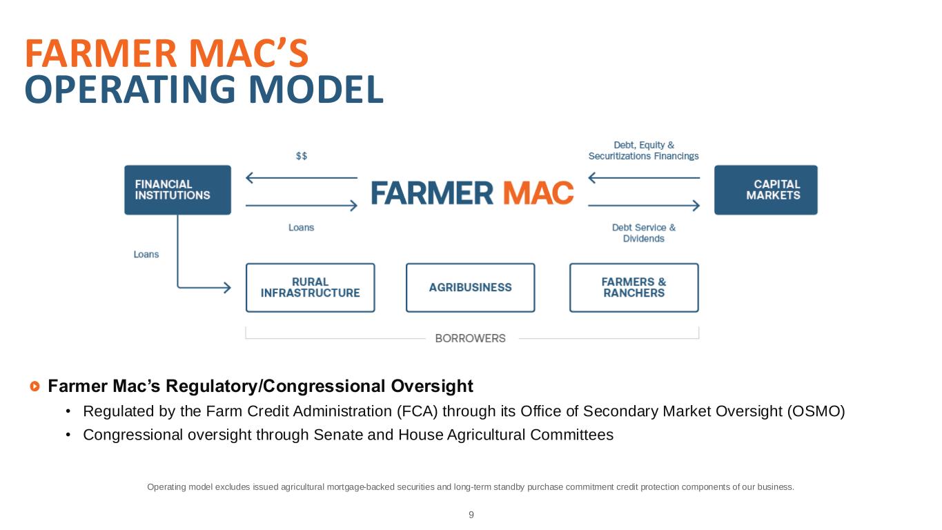 8 COMPETITIVE LANDSCAPE Farm Credit System (FCS) (Cooperative GSE) • Four FCS Banks • 56 Retail Agricultural Credit Associations Agricultural Mortgage Market (Farmers & Ranchers) (FCS Secondary Market GSE) Agricultural Finance Line of Business (Farm & Ranch and Corporate AgFinance) $345 BILLION Non-FCS Ag Lenders • Insurance Companies • Ag Banks • Non-Bank Lenders Mortgage FinancingMortgage Financing