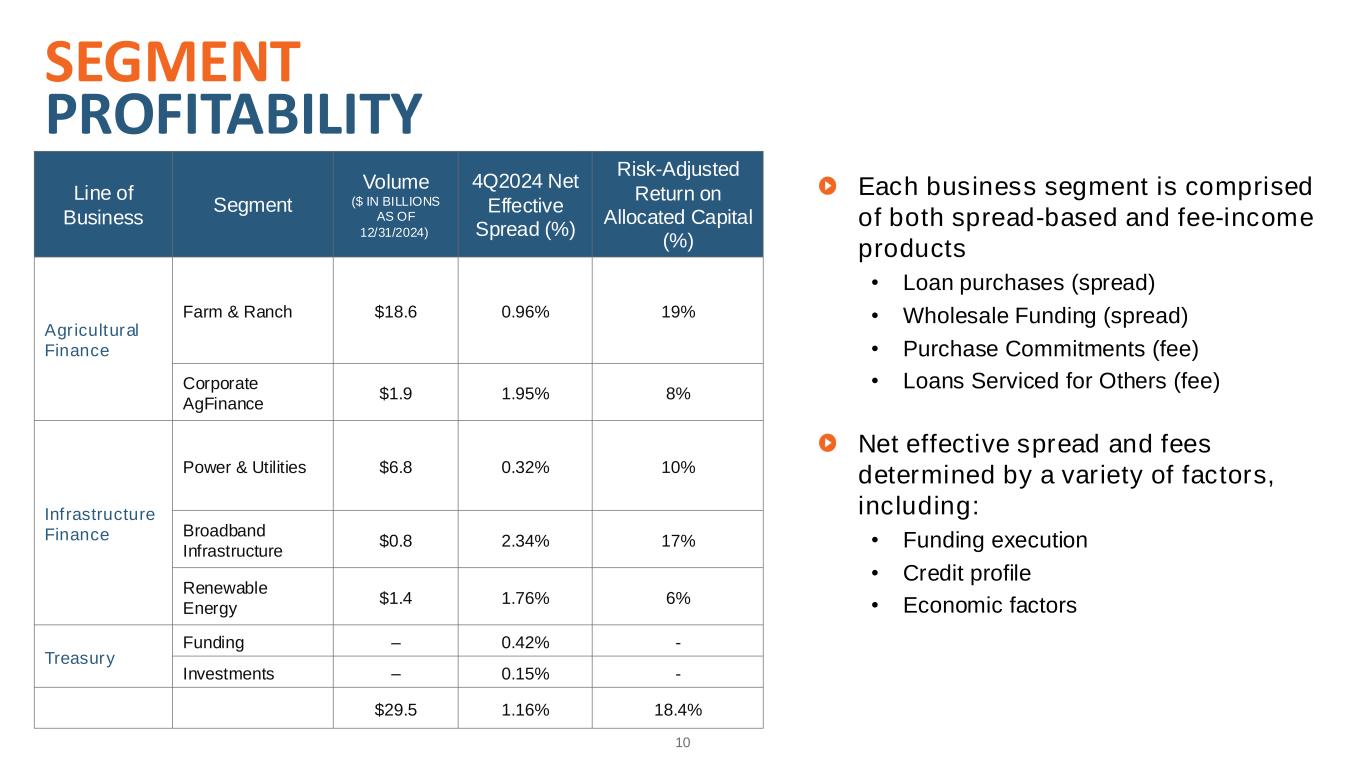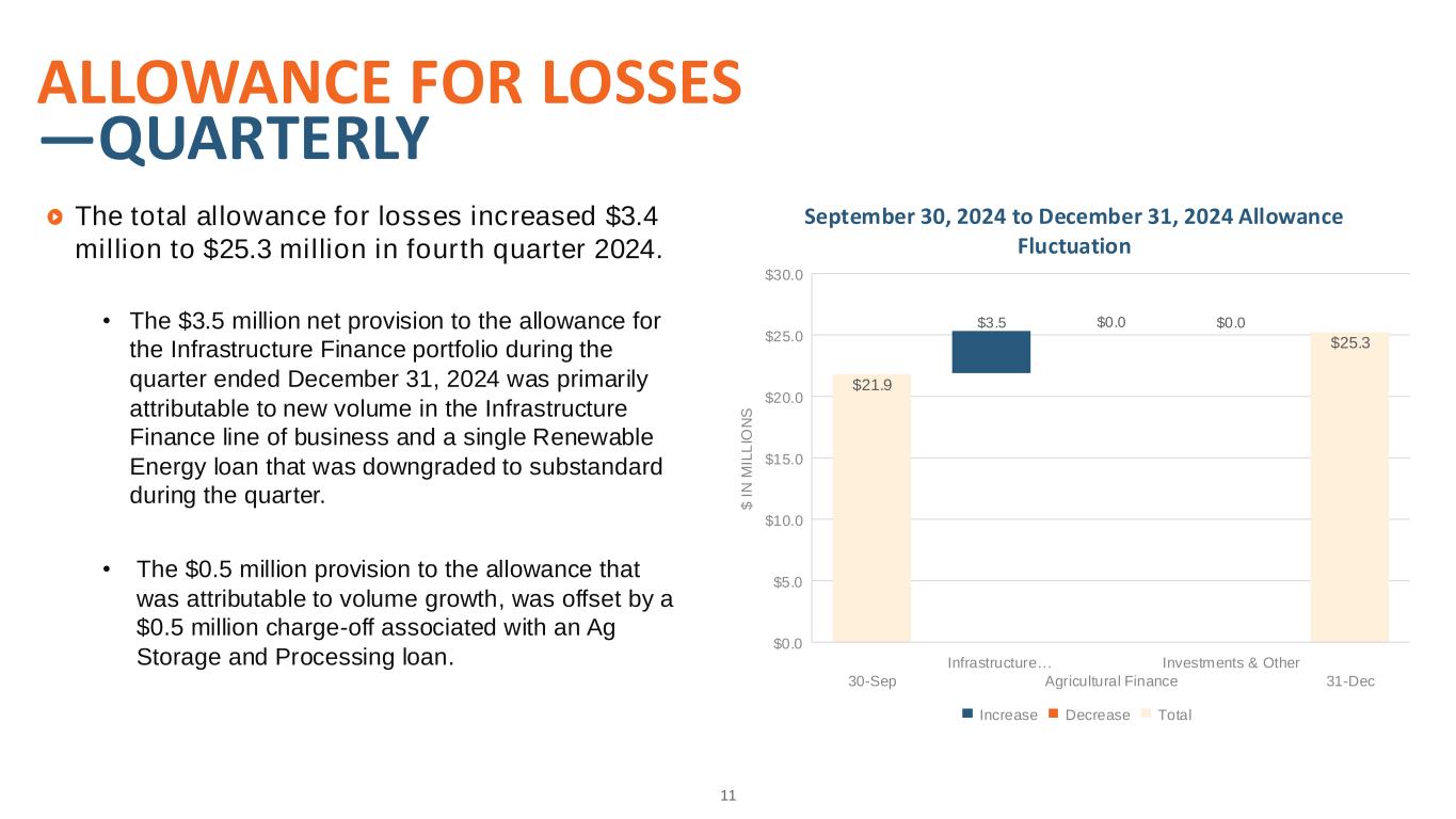 Each business segment is comprised of both spread-based and fee-income products • Loan purchases (spread) • Wholesale Funding (spread) • Purchase Commitments (fee) • Loans Serviced for Others (fee) Net effective spread and fees determined by a variety of factors, including: • Funding execution • Credit profile • Economic factors 10 SEGMENT PROFITABILITY Line of Business Segment Volume ($ IN BILLIONS AS OF 12/31/2024) 4Q2024 Net Effective Spread (%) Risk-Adjusted Return on Allocated Capital (%) Agricultural Finance Farm & Ranch $18.6 0.96% 19% Corporate AgFinance $1.9 1.95% 8% Infrastructure Finance Power & Utilities $6.8 0.32% 10% Broadband Infrastructure $0.8 2.34% 17% Renewable Energy $1.4 1.76% 6% Treasury Funding – 0.42% - Investments – 0.15% - $29.5 1.16% 18.4%