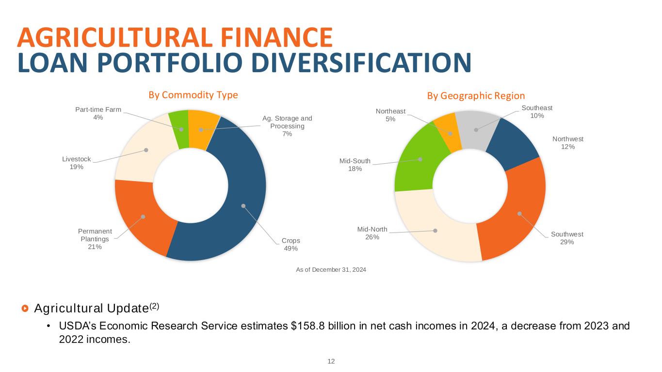 11 ALLOWANCE FOR LOSSES —QUARTERLY The total allowance for losses increased $3.4 million to $25.3 million in fourth quarter 2024. • The $3.5 million net provision to the allowance for the Infrastructure Finance portfolio during the quarter ended December 31, 2024 was primarily attributable to new volume in the Infrastructure Finance line of business and a single Renewable Energy loan that was downgraded to substandard during the quarter. • The $0.5 million provision to the allowance that was attributable to volume growth, was offset by a $0.5 million charge-off associated with an Ag Storage and Processing loan. $3.5 $0.0 $0.0 $21.9 $25.3 30-Sep Infrastructure … Agricultural Finance Investments & Other 31-Dec $ I N M IL L IO N S $0.0 $5.0 $10.0 $15.0 $20.0 $25.0 $30.0 September 30, 2024 to December 31, 2024 Allowance Fluctuation Increase Decrease Total