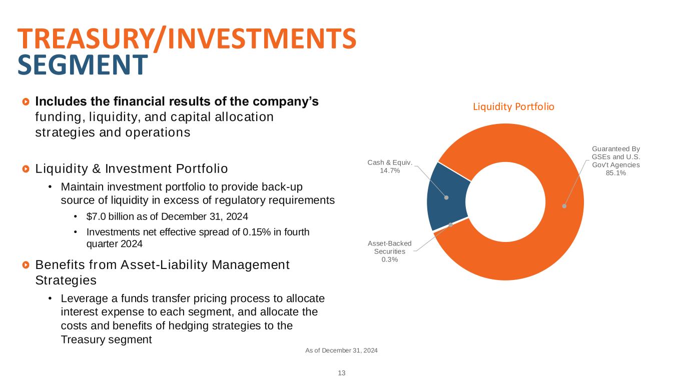 13 TREASURY/INVESTMENTS SEGMENT As of December 31, 2024 Includes the financial results of the company’s funding, liquidity, and capital allocation strategies and operations Liquidity & Investment Portfolio • Maintain investment portfolio to provide back-up source of liquidity in excess of regulatory requirements • $7.0 billion as of December 31, 2024 • Investments net effective spread of 0.15% in fourth quarter 2024 Benefits from Asset-Liability Management Strategies • Leverage a funds transfer pricing process to allocate interest expense to each segment, and allocate the costs and benefits of hedging strategies to the Treasury segment Cash & Equiv. 14.7% Guaranteed By GSEs and U.S. Gov't Agencies 85.1% Asset-Backed Securities 0.3% Liquidity Portfolio
