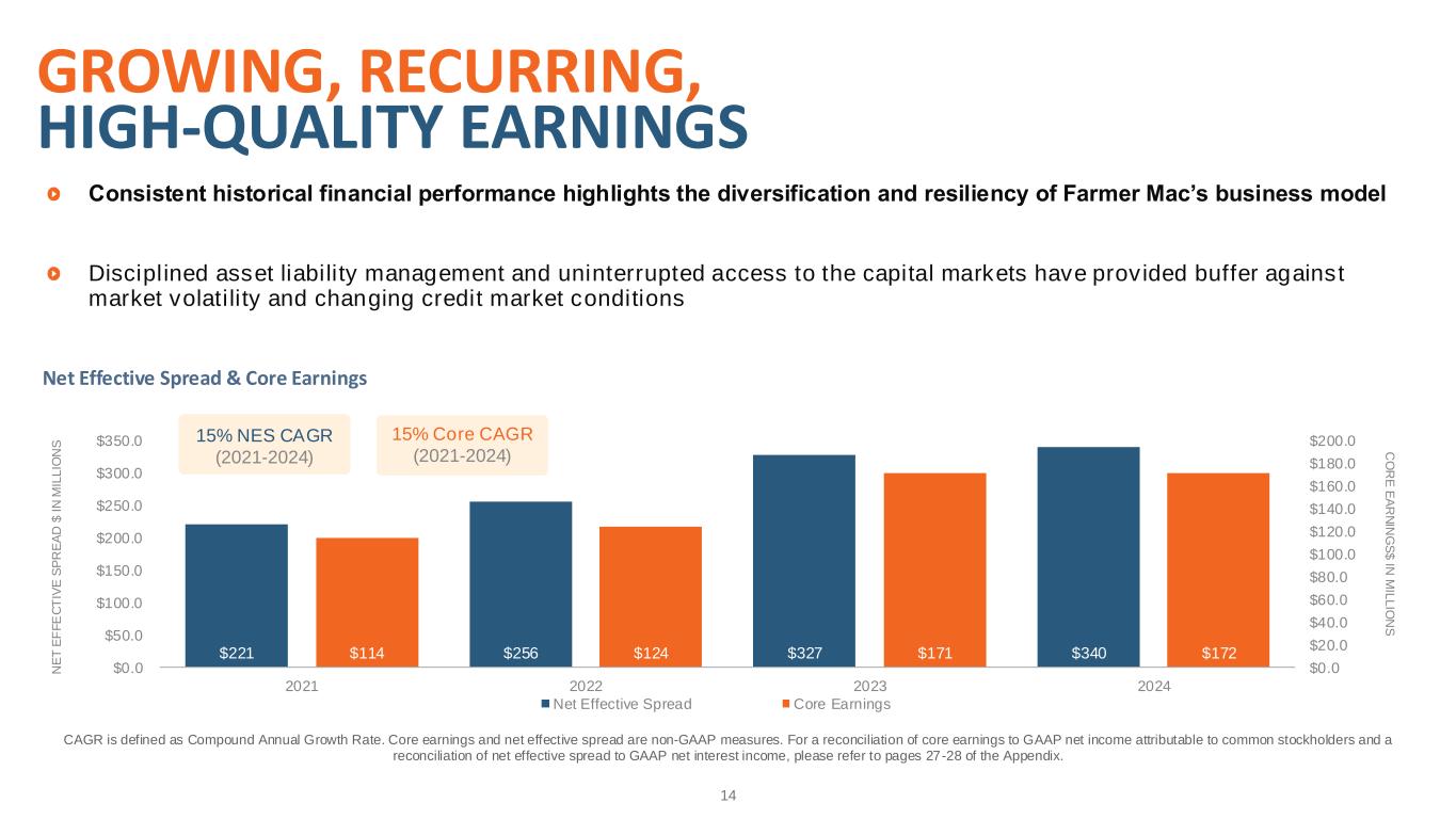 Use of Non-GAAP Financial Measures 3 This presentation is for general informational purposes only, is current only as of December 31, 2024 and should be read in conjunction with Farmer Mac’s Annual Report on Form 10-K filed with the SEC on February 21, 2025. In the accompanying analysis of its financial information, Farmer Mac uses the following non-GAAP financial measures: core earnings, core earnings per share, and net effective spread. Farmer Mac uses these non-GAAP measures to measure corporate economic performance and develop financial plans because, in management's view, they are useful alternative measures in understanding Farmer Mac's economic performance, transaction economics, and business trends. The non-GAAP financial measures that Farmer Mac uses may not be comparable to similarly labeled non-GAAP financial measures disclosed by other companies. Farmer Mac's disclosure of these non-GAAP financial measures is intended to be supplemental in nature and is not meant to be considered in isolation from, as a substitute for, or as more important than, the related financial information prepared in accordance with GAAP. Core earnings and core earnings per share principally differ from net income attributable to common stockholders and earnings per common share, respectively, by excluding the effects of fair value fluctuations. These fluctuations are not expected to have a cumulative net impact on Farmer Mac's financial condition or results of operations reported in accordance with GAAP if the related financial instruments are held to maturity, as is expected. Core earnings and core earnings per share also differ from net income attributable to common stockholders and earnings per common share, respectively, by excluding specified infrequent or unusual transactions that Farmer Mac believes are not indicative of future operating results and that may not reflect the trends and economic financial performance of Farmer Mac's core business. Farmer Mac uses net effective spread to measure the net spread Farmer Mac earns between its interest-earning assets and the related net funding costs of these assets. Net effective spread differs from net interest income and net interest yield because it excludes: (1) the interest income and interest expense associated with the consolidated trusts and the average balance of the loans underlying these trusts; and (2) the fair value changes of financial derivatives and the corresponding assets or liabilities designated in fair value hedge accounting relationships. Net effective spread also principally differs from net interest income and net interest yield because it includes the accrual of income and expense related to the contractual amounts due on financial derivatives that are not designated in hedge accounting relationships ("undesignated financial derivatives") and the net effects of terminations or net settlements on financial derivatives, which consist of: (1) the net effects of cash settlements on agency forward contracts on the debt of other GSEs and U.S. Treasury security futures that we use as short-term economic hedges on the issuance of debt; and (2) the net effects of initial cash payments that Farmer Mac receives upon the inception of certain swaps.