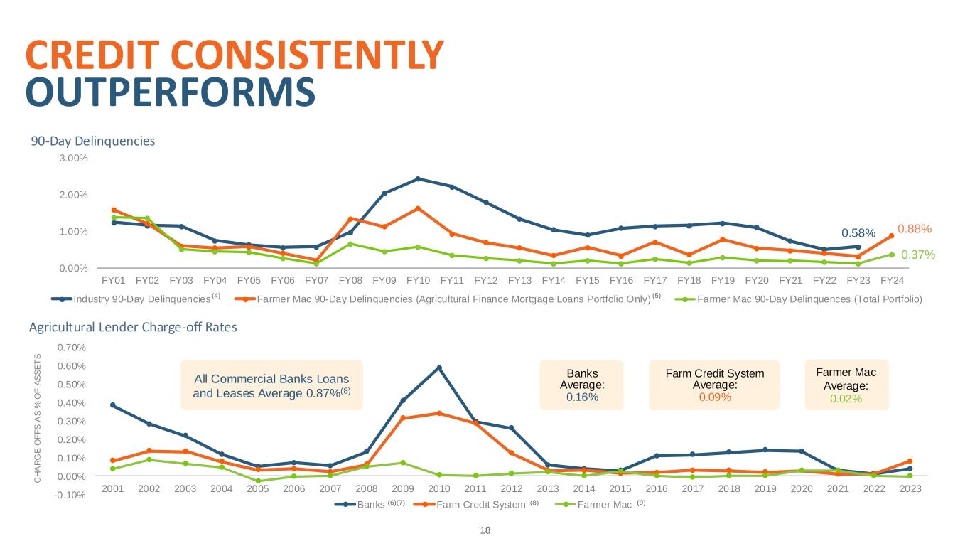 17 FARMER MAC USES PROVEN, RIGOROUS UNDERWRITING Industry-leading credit requirements • Total debt coverage ratio of at least 1.25x • LTVs average 40% to 45% on mortgages purchased • Minimum borrower net equity of 50% Credits are less likely to default • Focus on repayment capacity through stressed inputs • Not a “lender of last resort” • Farm Credit Administration is our safety and soundness regulator Losses less likely even in default • Average portfolio LTV of 46% as of December 31, 2024 • Land values need to decline >55% to generate material losses across Agricultural Finance mortgage loans portfolio • “Stress scenario” losses of 17% to 48% • 1980s crisis saw land value declines of ~23%(3)