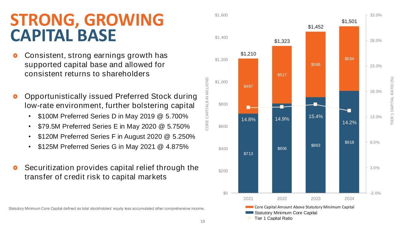 Consistent, strong earnings growth has supported capital base and allowed for consistent returns to shareholders Opportunistically issued Preferred Stock during low-rate environment, further bolstering capital • $100M Preferred Series D in May 2019 @ 5.700% • $79.5M Preferred Series E in May 2020 @ 5.750% • $120M Preferred Series F in August 2020 @ 5.250% • $125M Preferred Series G in May 2021 @ 4.875% Securitization provides capital relief through the transfer of credit risk to capital markets 19 STRONG, GROWING CAPITAL BASE Statutory Minimum Core Capital defined as total stockholders’ equity less accumulated other comprehensive income. $713 $806 $863 $918 $497 $517 $589 $584 $1,210 $1,323 $1,452 $1,501 14.8% 14.9% 15.4% 14.2% -2.0% 3.0% 8.0% 13.0% 18.0% 23.0% 28.0% 33.0% $0 $200 $400 $600 $800 $1,000 $1,200 $1,400 $1,600 2021 2022 2023 2024 T IE R 1 C A P IT A L R A T IO ( % ) C O R E C A P IT A L $ I N M IL L IO N S Core Capital Amount Above Statutory Minimum Capital Statutory Minimum Core Capital Tier 1 Capital Ratio