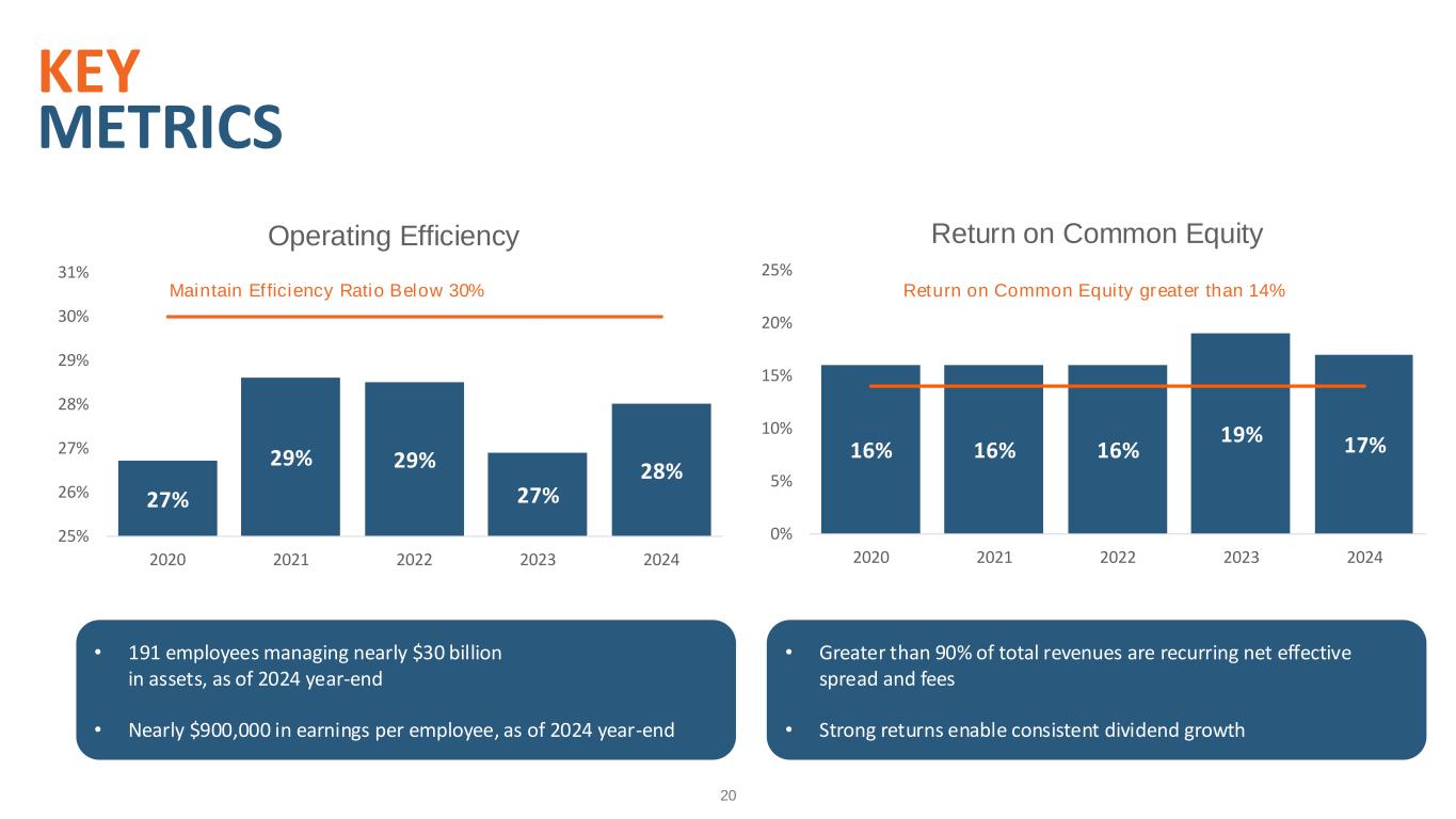 KEY METRICS 20 27% 29% 29% 27% 28% 25% 26% 27% 28% 29% 30% 31% 2020 2021 2022 2023 2024 Operating Efficiency Maintain Efficiency Ratio Below 30% 16% 16% 16% 19% 17% 0% 5% 10% 15% 20% 25% 2020 2021 2022 2023 2024 Return on Common Equity Return on Common Equity greater than 14% • 191 employees managing nearly $30 billion in assets, as of 2024 year-end • Nearly $900,000 in earnings per employee, as of 2024 year-end • Greater than 90% of total revenues are recurring net effective spread and fees • Strong returns enable consistent dividend growth