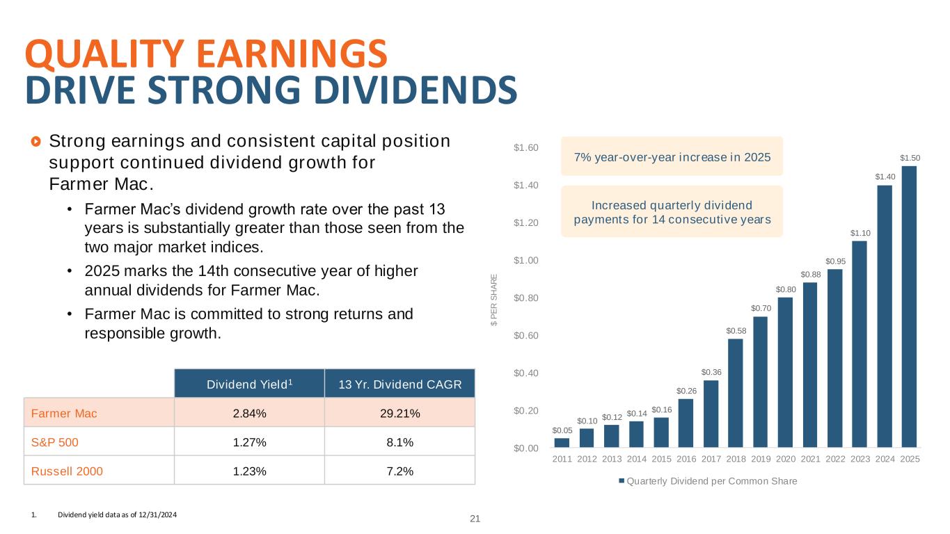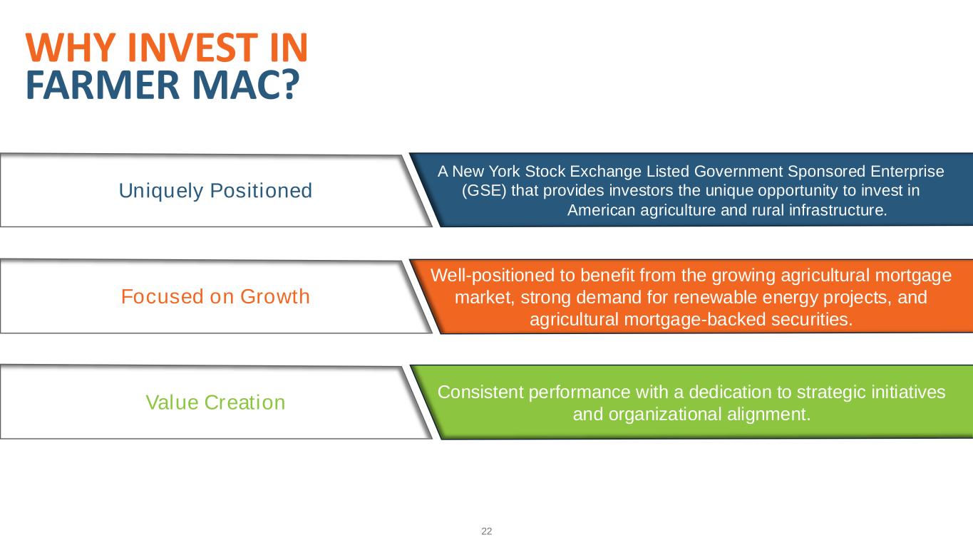 21 QUALITY EARNINGS DRIVE STRONG DIVIDENDS Strong earnings and consistent capital position support continued dividend growth for Farmer Mac. • Farmer Mac’s dividend growth rate over the past 13 years is substantially greater than those seen from the two major market indices. • 2025 marks the 14th consecutive year of higher annual dividends for Farmer Mac. • Farmer Mac is committed to strong returns and responsible growth. Dividend Yield1 13 Yr. Dividend CAGR Farmer Mac 2.84% 29.21% S&P 500 1.27% 8.1% Russell 2000 1.23% 7.2% $0.05 $0.10 $0.12 $0.14 $0.16 $0.26 $0.36 $0.58 $0.70 $0.80 $0.88 $0.95 $1.10 $1.40 $1.50 $0.00 $0.20 $0.40 $0.60 $0.80 $1.00 $1.20 $1.40 $1.60 2011 2012 2013 2014 2015 2016 2017 2018 2019 2020 2021 2022 2023 2024 2025 $ P E R S H A R E Quarterly Dividend per Common Share 7% year-over-year increase in 2025 Increased quarterly dividend payments for 14 consecutive years 1. Dividend yield data as of 12/31/2024