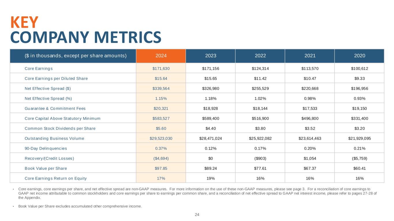 24 KEY COMPANY METRICS ($ in thousands, except per share amounts) 2024 2023 2022 2021 2020 Core Earnings $171,630 $171,156 $124,314 $113,570 $100,612 Core Earnings per Diluted Share $15.64 $15.65 $11.42 $10.47 $9.33 Net Effective Spread ($) $339,564 $326,980 $255,529 $220,668 $196,956 Net Effective Spread (%) 1.15% 1.18% 1.02% 0.98% 0.93% Guarantee & Commitment Fees $20,321 $18,928 $18,144 $17,533 $19,150 Core Capital Above Statutory Minimum $583,527 $589,400 $516,900 $496,800 $331,400 Common Stock Dividends per Share $5.60 $4.40 $3.80 $3.52 $3.20 Outstanding Business Volume $29,523,030 $28,471,024 $25,922,082 $23,614,463 $21,929,095 90-Day Delinquencies 0.37% 0.12% 0.17% 0.20% 0.21% Recovery/(Credit Losses) ($4,694) $0 ($903) $1,054 ($5,759) Book Value per Share $97.85 $89.24 $77.61 $67.37 $60.41 Core Earnings Return on Equity 17% 19% 16% 16% 16% • Core earnings, core earnings per share, and net effective spread are non-GAAP measures. For more information on the use of these non-GAAP measures, please see page 3. For a reconciliation of core earnings to GAAP net income attributable to common stockholders and core earnings per share to earnings per common share, and a reconciliation of net effective spread to GAAP net interest income, please refer to pages 27-28 of the Appendix. • Book Value per Share excludes accumulated other comprehensive income.
