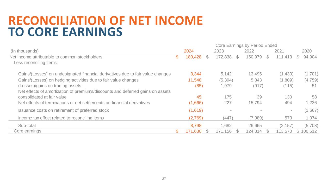 27 RECONCILIATION OF NET INCOME TO CORE EARNINGS (in thousands) 2024 2023 2022 2021 2020 Net income attributable to common stockholders 180,428$ 172,838$ 150,979$ 111,413$ 94,904$ Less reconciling items: Gains/(Losses) on undesignated financial derivatives due to fair value changes 3,344 5,142 13,495 (1,430) (1,701) Gains/(Losses) on hedging activities due to fair value changes 11,548 (5,394) 5,343 (1,809) (4,759) (Losses)/gains on trading assets (85) 1,979 (917) (115) 51 Net effects of amortization of premiums/discounts and deferred gains on assets consolidated at fair value 45 175 39 130 58 Net effects of terminations or net settlements on financial derivatives (1,666) 227 15,794 494 1,236 Issuance costs on retirement of preferred stock (1,619) - - - (1,667) Income tax effect related to reconciling items (2,769) (447) (7,089) 573 1,074 Sub-total 8,798 1,682 26,665 (2,157) (5,708) Core earnings 171,630$ 171,156$ 124,314$ 113,570$ 100,612$ Core Earnings by Period Ended