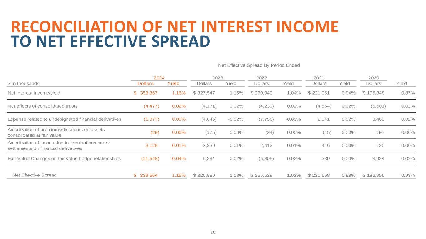 28 RECONCILIATION OF NET INTEREST INCOME TO NET EFFECTIVE SPREAD 2022 2021 2020 $ in thousands Dollars Yield Dollars Yield Dollars Yield Dollars Yield Dollars Yield Net interest income/yield 353,867$ 1.16% 327,547$ 1.15% 270,940$ 1.04% 221,951$ 0.94% 195,848$ 0.87% Net effects of consolidated trusts (4,477) 0.02% (4,171) 0.02% (4,239) 0.02% (4,864) 0.02% (6,601) 0.02% Expense related to undesignated financial derivatives (1,377) 0.00% (4,845) -0.02% (7,756) -0.03% 2,841 0.02% 3,468 0.02% Amortization of premiums/discounts on assets consolidated at fair value (29) 0.00% (175) 0.00% (24) 0.00% (45) 0.00% 197 0.00% Amortization of losses due to terminations or net settlements on financial derivatives 3,128 0.01% 3,230 0.01% 2,413 0.01% 446 0.00% 120 0.00% Fair Value Changes on fair value hedge relationships (11,548) -0.04% 5,394 0.02% (5,805) -0.02% 339 0.00% 3,924 0.02% Net Effective Spread 339,564$ 1.15% 326,980$ 1.18% 255,529$ 1.02% 220,668$ 0.98% 196,956$ 0.93% 2024 Net Effective Spread By Period Ended 2023
