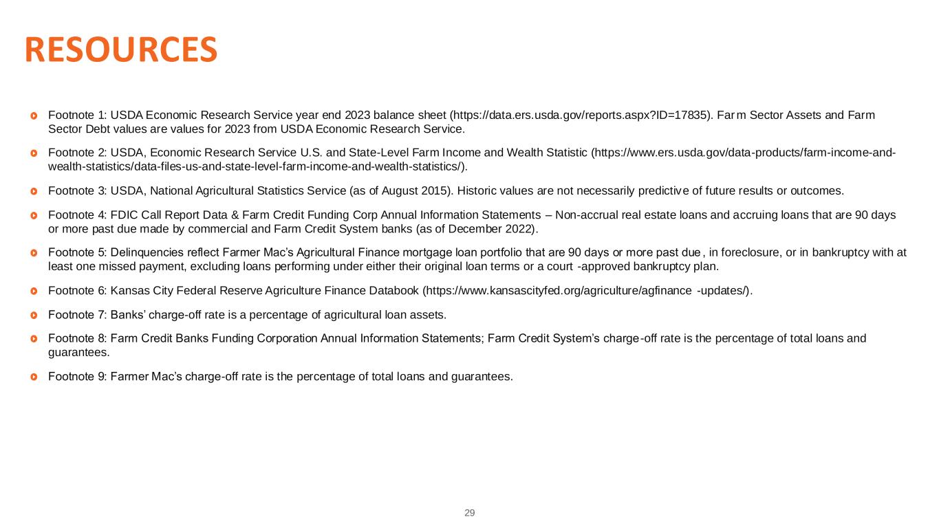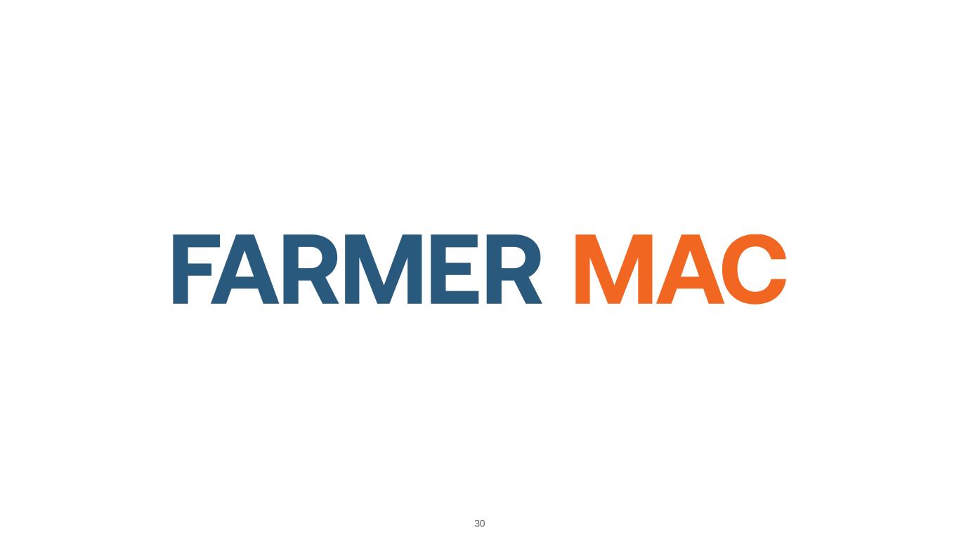 29 RESOURCES Footnote 1: USDA Economic Research Service year end 2023 balance sheet (https://data.ers.usda.gov/reports.aspx?ID=17835). Far m Sector Assets and Farm Sector Debt values are values for 2023 from USDA Economic Research Service. Footnote 2: USDA, Economic Research Service U.S. and State-Level Farm Income and Wealth Statistic (https://www.ers.usda.gov/data-products/farm-income-and- wealth-statistics/data-files-us-and-state-level-farm-income-and-wealth-statistics/). Footnote 3: USDA, National Agricultural Statistics Service (as of August 2015). Historic values are not necessarily predictive of future results or outcomes. Footnote 4: FDIC Call Report Data & Farm Credit Funding Corp Annual Information Statements – Non-accrual real estate loans and accruing loans that are 90 days or more past due made by commercial and Farm Credit System banks (as of December 2022). Footnote 5: Delinquencies reflect Farmer Mac’s Agricultural Finance mortgage loan portfolio that are 90 days or more past due , in foreclosure, or in bankruptcy with at least one missed payment, excluding loans performing under either their original loan terms or a court -approved bankruptcy plan. Footnote 6: Kansas City Federal Reserve Agriculture Finance Databook (https://www.kansascityfed.org/agriculture/agfinance -updates/). Footnote 7: Banks’ charge-off rate is a percentage of agricultural loan assets. Footnote 8: Farm Credit Banks Funding Corporation Annual Information Statements; Farm Credit System’s charge-off rate is the percentage of total loans and guarantees. Footnote 9: Farmer Mac’s charge-off rate is the percentage of total loans and guarantees.