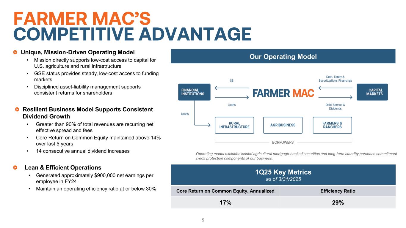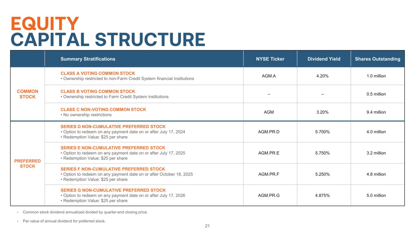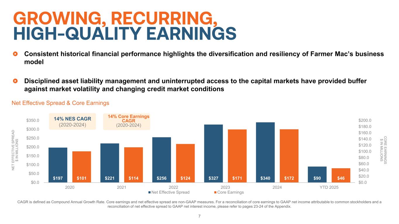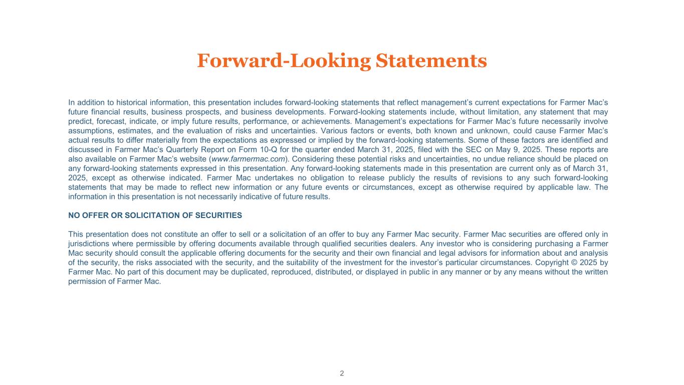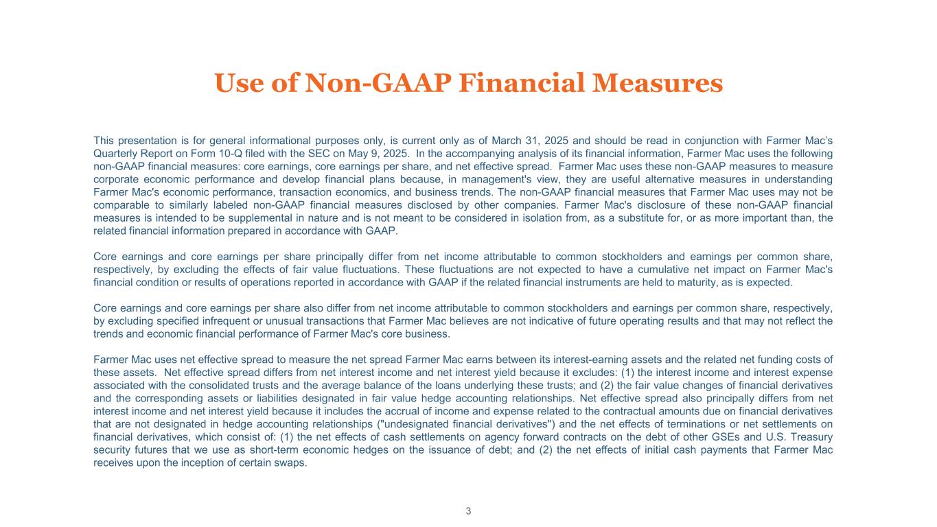 Forward-Looking Statements 2 In addition to historical information, this presentation includes forward-looking statements that reflect management’s current expectations for Farmer Mac’s future financial results, business prospects, and business developments. Forward-looking statements include, without limitation, any statement that may predict, forecast, indicate, or imply future results, performance, or achievements. Management’s expectations for Farmer Mac’s future necessarily involve assumptions, estimates, and the evaluation of risks and uncertainties. Various factors or events, both known and unknown, could cause Farmer Mac’s actual results to differ materially from the expectations as expressed or implied by the forward-looking statements. Some of these factors are identified and discussed in Farmer Mac’s Quarterly Report on Form 10-Q for the quarter ended March 31, 2025, filed with the SEC on May 9, 2025. These reports are also available on Farmer Mac’s website (www.farmermac.com). Considering these potential risks and uncertainties, no undue reliance should be placed on any forward-looking statements expressed in this presentation. Any forward-looking statements made in this presentation are current only as of March 31, 2025, except as otherwise indicated. Farmer Mac undertakes no obligation to release publicly the results of revisions to any such forward-looking statements that may be made to reflect new information or any future events or circumstances, except as otherwise required by applicable law. The information in this presentation is not necessarily indicative of future results. NO OFFER OR SOLICITATION OF SECURITIES This presentation does not constitute an offer to sell or a solicitation of an offer to buy any Farmer Mac security. Farmer Mac securities are offered only in jurisdictions where permissible by offering documents available through qualified securities dealers. Any investor who is considering purchasing a Farmer Mac security should consult the applicable offering documents for the security and their own financial and legal advisors for information about and analysis of the security, the risks associated with the security, and the suitability of the investment for the investor’s particular circumstances. Copyright © 2025 by Farmer Mac. No part of this document may be duplicated, reproduced, distributed, or displayed in public in any manner or by any means without the written permission of Farmer Mac.