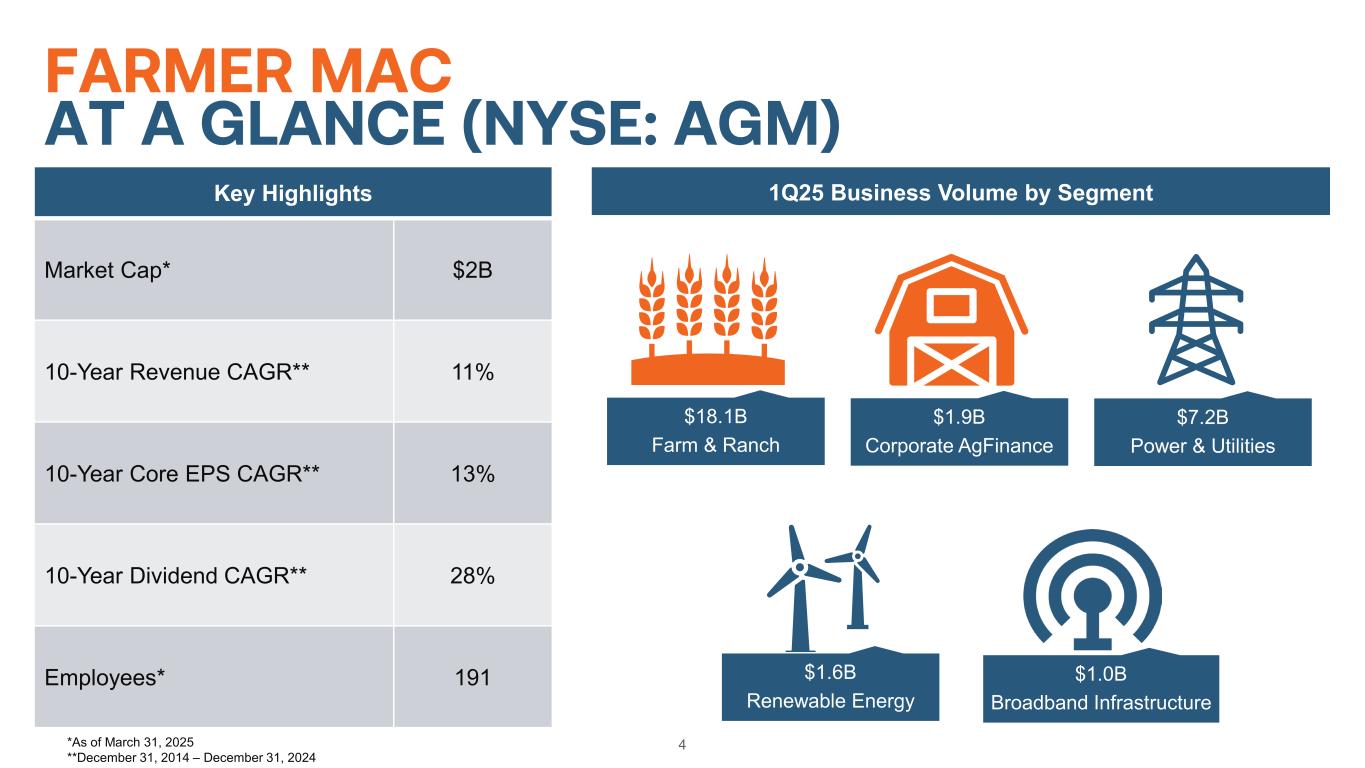 Use of Non-GAAP Financial Measures 3 This presentation is for general informational purposes only, is current only as of March 31, 2025 and should be read in conjunction with Farmer Mac’s Quarterly Report on Form 10-Q filed with the SEC on May 9, 2025. In the accompanying analysis of its financial information, Farmer Mac uses the following non-GAAP financial measures: core earnings, core earnings per share, and net effective spread. Farmer Mac uses these non-GAAP measures to measure corporate economic performance and develop financial plans because, in management's view, they are useful alternative measures in understanding Farmer Mac's economic performance, transaction economics, and business trends. The non-GAAP financial measures that Farmer Mac uses may not be comparable to similarly labeled non-GAAP financial measures disclosed by other companies. Farmer Mac's disclosure of these non-GAAP financial measures is intended to be supplemental in nature and is not meant to be considered in isolation from, as a substitute for, or as more important than, the related financial information prepared in accordance with GAAP. Core earnings and core earnings per share principally differ from net income attributable to common stockholders and earnings per common share, respectively, by excluding the effects of fair value fluctuations. These fluctuations are not expected to have a cumulative net impact on Farmer Mac's financial condition or results of operations reported in accordance with GAAP if the related financial instruments are held to maturity, as is expected. Core earnings and core earnings per share also differ from net income attributable to common stockholders and earnings per common share, respectively, by excluding specified infrequent or unusual transactions that Farmer Mac believes are not indicative of future operating results and that may not reflect the trends and economic financial performance of Farmer Mac's core business. Farmer Mac uses net effective spread to measure the net spread Farmer Mac earns between its interest-earning assets and the related net funding costs of these assets. Net effective spread differs from net interest income and net interest yield because it excludes: (1) the interest income and interest expense associated with the consolidated trusts and the average balance of the loans underlying these trusts; and (2) the fair value changes of financial derivatives and the corresponding assets or liabilities designated in fair value hedge accounting relationships. Net effective spread also principally differs from net interest income and net interest yield because it includes the accrual of income and expense related to the contractual amounts due on financial derivatives that are not designated in hedge accounting relationships ("undesignated financial derivatives") and the net effects of terminations or net settlements on financial derivatives, which consist of: (1) the net effects of cash settlements on agency forward contracts on the debt of other GSEs and U.S. Treasury security futures that we use as short-term economic hedges on the issuance of debt; and (2) the net effects of initial cash payments that Farmer Mac receives upon the inception of certain swaps.