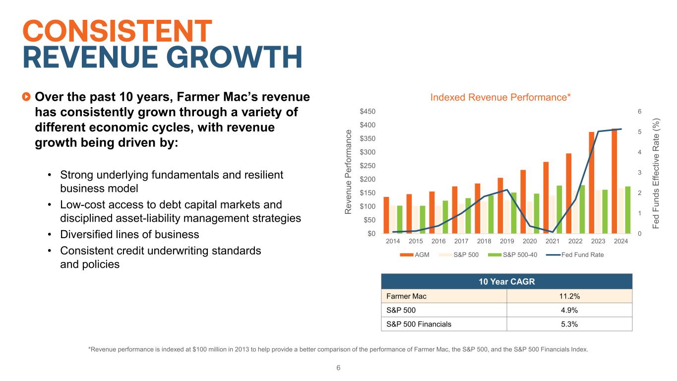 1Q25 Key Metrics as of 3/31/2025 Core Return on Common Equity, Annualized Efficiency Ratio 17% 29% Unique, Mission-Driven Operating Model • Mission directly supports low-cost access to capital for U.S. agriculture and rural infrastructure • GSE status provides steady, low-cost access to funding markets • Disciplined asset-liability management supports consistent returns for shareholders Resilient Business Model Supports Consistent Dividend Growth • Greater than 90% of total revenues are recurring net effective spread and fees • Core Return on Common Equity maintained above 14% over last 5 years • 14 consecutive annual dividend increases Lean & Efficient Operations • Generated approximately $900,000 net earnings per employee in FY24 • Maintain an operating efficiency ratio at or below 30% 5 FARMER MAC’S COMPETITIVE ADVANTAGE Our Operating Model Operating model excludes issued agricultural mortgage-backed securities and long-term standby purchase commitment credit protection components of our business.