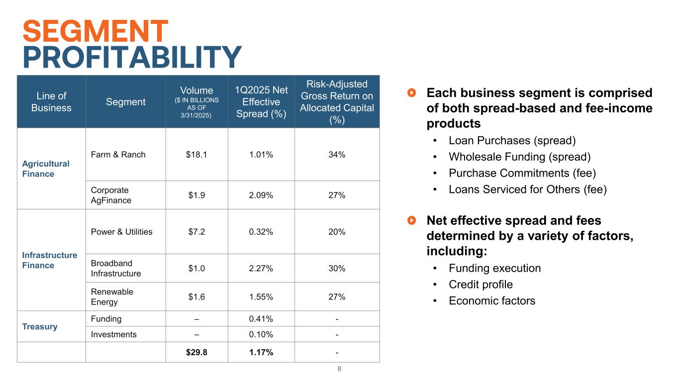 Each business segment is comprised of both spread-based and fee-income products • Loan Purchases (spread) • Wholesale Funding (spread) • Purchase Commitments (fee) • Loans Serviced for Others (fee) Net effective spread and fees determined by a variety of factors, including: • Funding execution • Credit profile • Economic factors 8 SEGMENT PROFITABILITY Line of Business Segment Volume ($ IN BILLIONS AS OF 3/31/2025) 1Q2025 Net Effective Spread (%) Risk-Adjusted Gross Return on Allocated Capital (%) Agricultural Finance Farm & Ranch $18.1 1.01% 34% Corporate AgFinance $1.9 2.09% 27% Infrastructure Finance Power & Utilities $7.2 0.32% 20% Broadband Infrastructure $1.0 2.27% 30% Renewable Energy $1.6 1.55% 27% Treasury Funding – 0.41% - Investments – 0.10% - $29.8 1.17% -