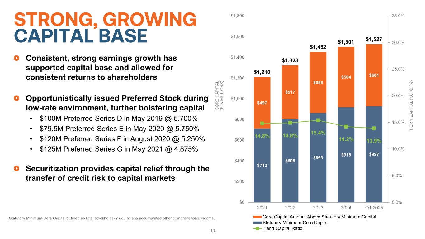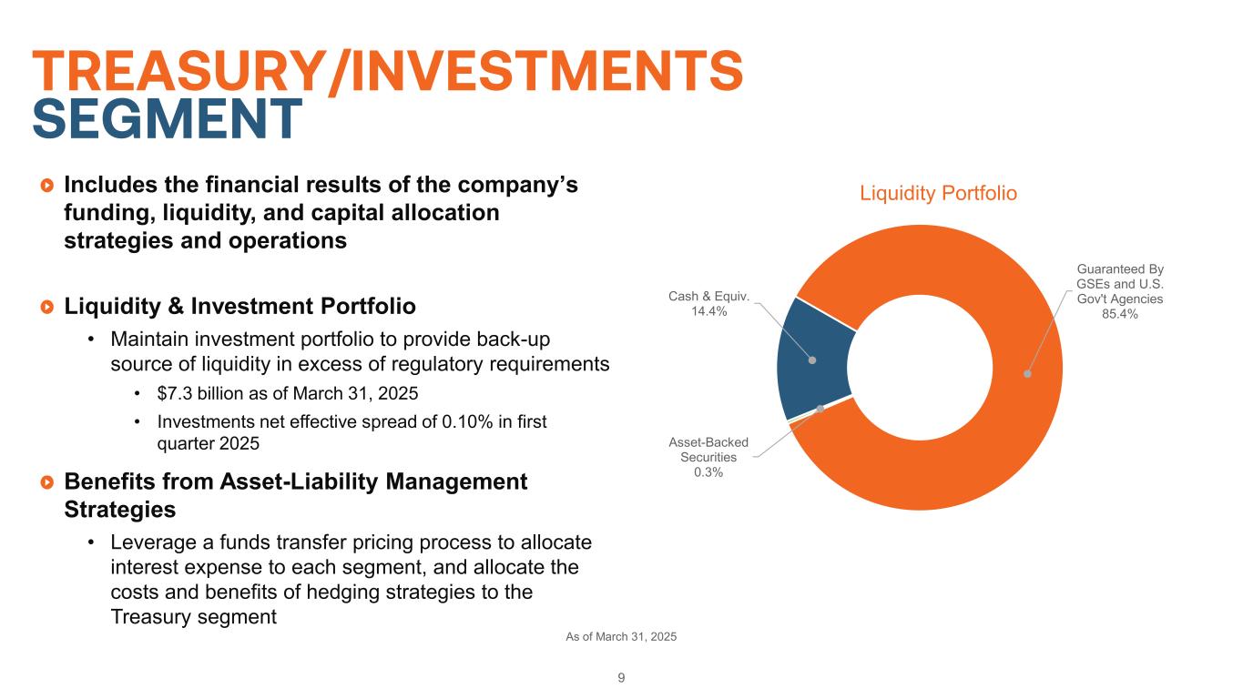 9 TREASURY/INVESTMENTS SEGMENT As of March 31, 2025 Includes the financial results of the company’s funding, liquidity, and capital allocation strategies and operations Liquidity & Investment Portfolio • Maintain investment portfolio to provide back-up source of liquidity in excess of regulatory requirements • $7.3 billion as of March 31, 2025 • Investments net effective spread of 0.10% in first quarter 2025 Benefits from Asset-Liability Management Strategies • Leverage a funds transfer pricing process to allocate interest expense to each segment, and allocate the costs and benefits of hedging strategies to the Treasury segment Cash & Equiv. 14.4% Guaranteed By GSEs and U.S. Gov't Agencies 85.4% Asset-Backed Securities 0.3% Liquidity Portfolio