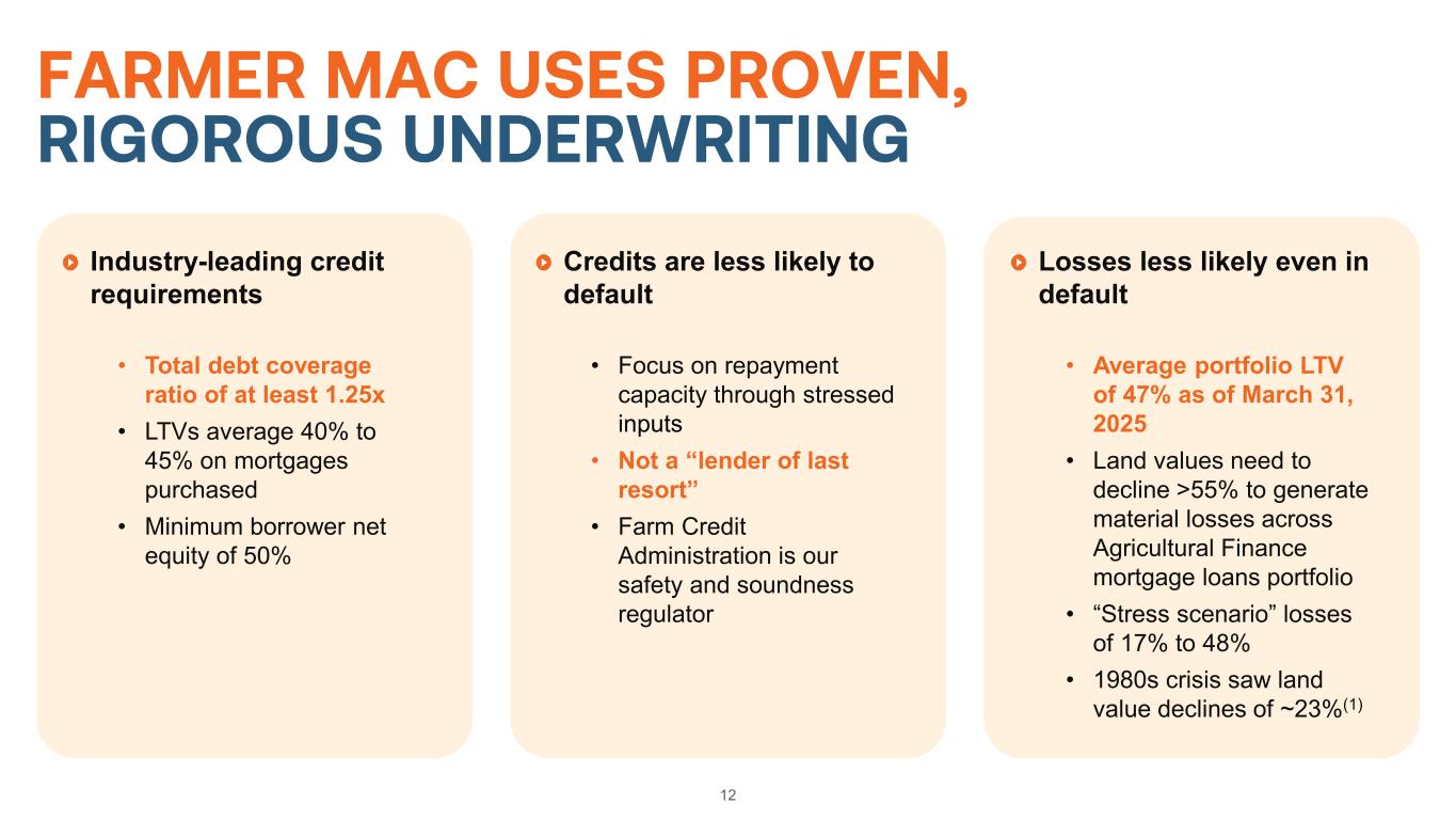 11 QUALITY EARNINGS DRIVE STRONG DIVIDENDS Strong earnings and consistent capital position support continued dividend growth for Farmer Mac. • Farmer Mac’s dividend growth rate over the past 14 years is substantially greater than that seen from the two major market indices. • 2025 marks the 14th consecutive year of higher annual dividends for Farmer Mac. • Farmer Mac is committed to strong returns and responsible growth. Dividend Yield1 14 Yr. Dividend CAGR Farmer Mac 3.2% 27.5% S&P 500 1.3% 5.1% Russell 2000 1.2% 6.6% $0.05 $0.10 $0.12 $0.14 $0.16 $0.26 $0.36 $0.58 $0.70 $0.80 $0.88 $0.95 $1.10 $1.40 $1.50 $0.00 $0.20 $0.40 $0.60 $0.80 $1.00 $1.20 $1.40 $1.60 2011 2012 2013 2014 2015 2016 2017 2018 2019 2020 2021 2022 2023 2024 2025 $ PE R S H AR E Quarterly Dividend per Common Share 7% year-over-year increase in 2025 Increased quarterly dividend payments for 14 consecutive years 1. Dividend yield data as of 3/31/2025