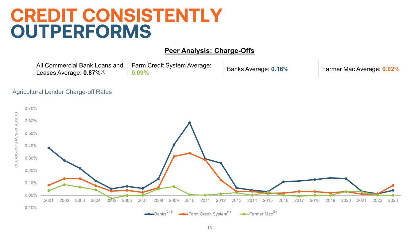 12 FARMER MAC USES PROVEN, RIGOROUS UNDERWRITING Industry-leading credit requirements • Total debt coverage ratio of at least 1.25x • LTVs average 40% to 45% on mortgages purchased • Minimum borrower net equity of 50% Credits are less likely to default • Focus on repayment capacity through stressed inputs • Not a “lender of last resort” • Farm Credit Administration is our safety and soundness regulator Losses less likely even in default • Average portfolio LTV of 47% as of March 31, 2025 • Land values need to decline >55% to generate material losses across Agricultural Finance mortgage loans portfolio • “Stress scenario” losses of 17% to 48% • 1980s crisis saw land value declines of ~23%(1)