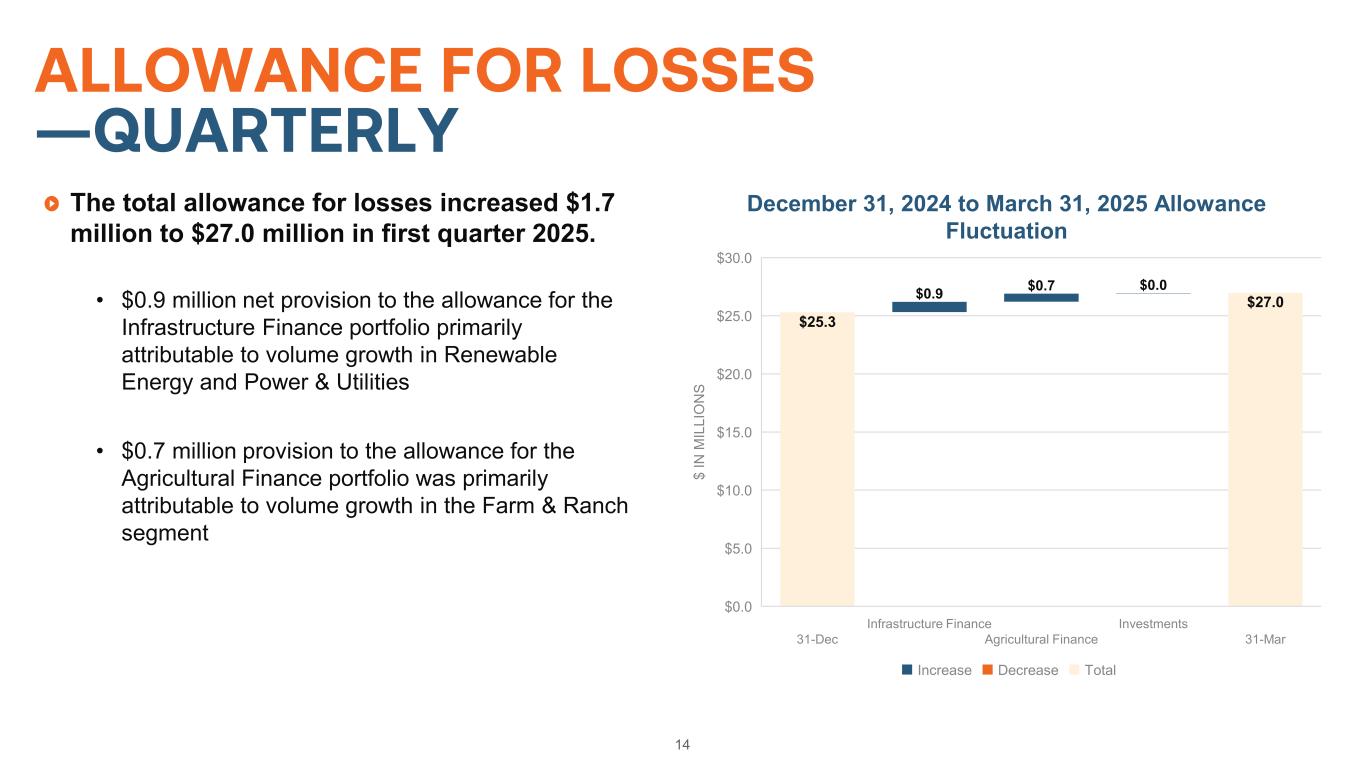 14 ALLOWANCE FOR LOSSES —QUARTERLY The total allowance for losses increased $1.7 million to $27.0 million in first quarter 2025. • $0.9 million net provision to the allowance for the Infrastructure Finance portfolio primarily attributable to volume growth in Renewable Energy and Power & Utilities • $0.7 million provision to the allowance for the Agricultural Finance portfolio was primarily attributable to volume growth in the Farm & Ranch segment $0.9 $0.7 $0.0 $25.3 $27.0 31-Dec Infrastructure Finance Agricultural Finance Investments 31-Mar $ IN M IL LI O N S $0.0 $5.0 $10.0 $15.0 $20.0 $25.0 $30.0 December 31, 2024 to March 31, 2025 Allowance Fluctuation Increase Decrease Total