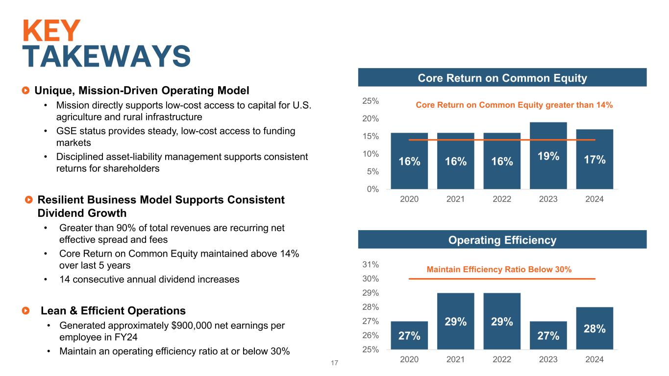 Unique, Mission-Driven Operating Model • Mission directly supports low-cost access to capital for U.S. agriculture and rural infrastructure • GSE status provides steady, low-cost access to funding markets • Disciplined asset-liability management supports consistent returns for shareholders Resilient Business Model Supports Consistent Dividend Growth • Greater than 90% of total revenues are recurring net effective spread and fees • Core Return on Common Equity maintained above 14% over last 5 years • 14 consecutive annual dividend increases Lean & Efficient Operations • Generated approximately $900,000 net earnings per employee in FY24 • Maintain an operating efficiency ratio at or below 30% 17 KEY TAKEWAYS 27% 29% 29% 27% 28% 25% 26% 27% 28% 29% 30% 31% 2020 2021 2022 2023 2024 Maintain Efficiency Ratio Below 30% 16% 16% 16% 19% 17% 0% 5% 10% 15% 20% 25% 2020 2021 2022 2023 2024 Core Return on Common Equity greater than 14% Core Return on Common Equity Operating Efficiency