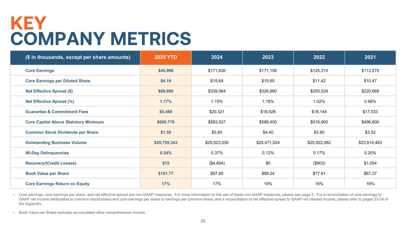 20 KEY COMPANY METRICS ($ in thousands, except per share amounts) 2025 YTD 2024 2023 2022 2021 Core Earnings $45,966 $171,630 $171,156 $124,314 $113,570 Core Earnings per Diluted Share $4.19 $15.64 $15.65 $11.42 $10.47 Net Effective Spread ($) $89,990 $339,564 $326,980 $255,529 $220,668 Net Effective Spread (%) 1.17% 1.15% 1.18% 1.02% 0.98% Guarantee & Commitment Fees $5,488 $20,321 $18,928 $18,144 $17,533 Core Capital Above Statutory Minimum $600,776 $583,527 $589,400 $516,900 $496,800 Common Stock Dividends per Share $1.50 $5.60 $4.40 $3.80 $3.52 Outstanding Business Volume $29,755,343 $29,523,030 $28,471,024 $25,922,082 $23,614,463 90-Day Delinquencies 0.54% 0.37% 0.12% 0.17% 0.20% Recovery/(Credit Losses) $15 ($4,694) $0 ($903) $1,054 Book Value per Share $101.77 $97.85 $89.24 $77.61 $67.37 Core Earnings Return on Equity 17% 17% 19% 16% 16% • Core earnings, core earnings per share, and net effective spread are non-GAAP measures. For more information on the use of these non-GAAP measures, please see page 3. For a reconciliation of core earnings to GAAP net income attributable to common stockholders and core earnings per share to earnings per common share, and a reconciliation of net effective spread to GAAP net interest income, please refer to pages 23-24 of the Appendix. • Book Value per Share excludes accumulated other comprehensive income.