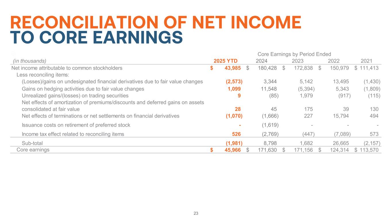 23 RECONCILIATION OF NET INCOME TO CORE EARNINGS (in thousands) 2025 YTD 2024 2023 2022 2021 Net income attributable to common stockholders 43,985$ 180,428$ 172,838$ 150,979$ 111,413$ Less reconciling items: (Losses)/gains on undesignated financial derivatives due to fair value changes (2,573) 3,344 5,142 13,495 (1,430) Gains on hedging activities due to fair value changes 1,099 11,548 (5,394) 5,343 (1,809) Unrealized gains/(losses) on trading securities 9 (85) 1,979 (917) (115) Net effects of amortization of premiums/discounts and deferred gains on assets consolidated at fair value 28 45 175 39 130 Net effects of terminations or net settlements on financial derivatives (1,070) (1,666) 227 15,794 494 Issuance costs on retirement of preferred stock - (1,619) - - - Income tax effect related to reconciling items 526 (2,769) (447) (7,089) 573 Sub-total (1,981) 8,798 1,682 26,665 (2,157) Core earnings 45,966$ 171,630$ 171,156$ 124,314$ 113,570$ Core Earnings by Period Ended